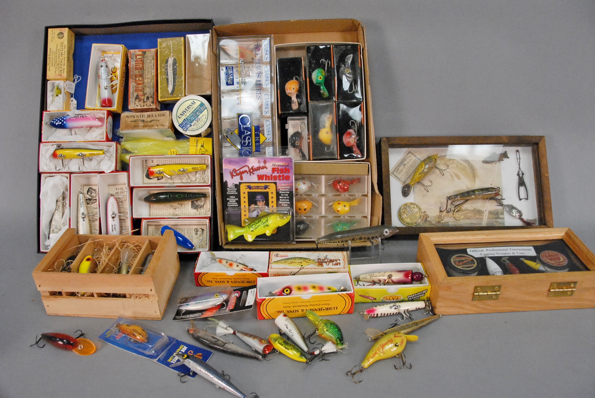 Tony Accetta group of five display cases with crawlers, Jigit with spinner, Jigit Baby, Sneaky Pete, Spinning tackle box with contents, Jigging box, Belly Button, Hollo heads, eighteen Jigolets, and eighteen Champs.