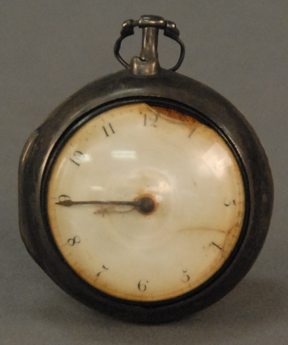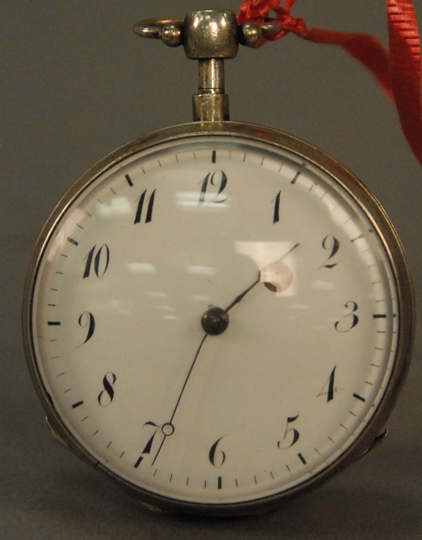 Early key wind fusee pocket watch, works marked Wm. Morgan London, dial with rust marks, inside paper labels of John Donallan Watch Maker & Jewelry, E. Cambridge Mass. and Spittle Clock & Watch Maker and umbrellas repaired.
