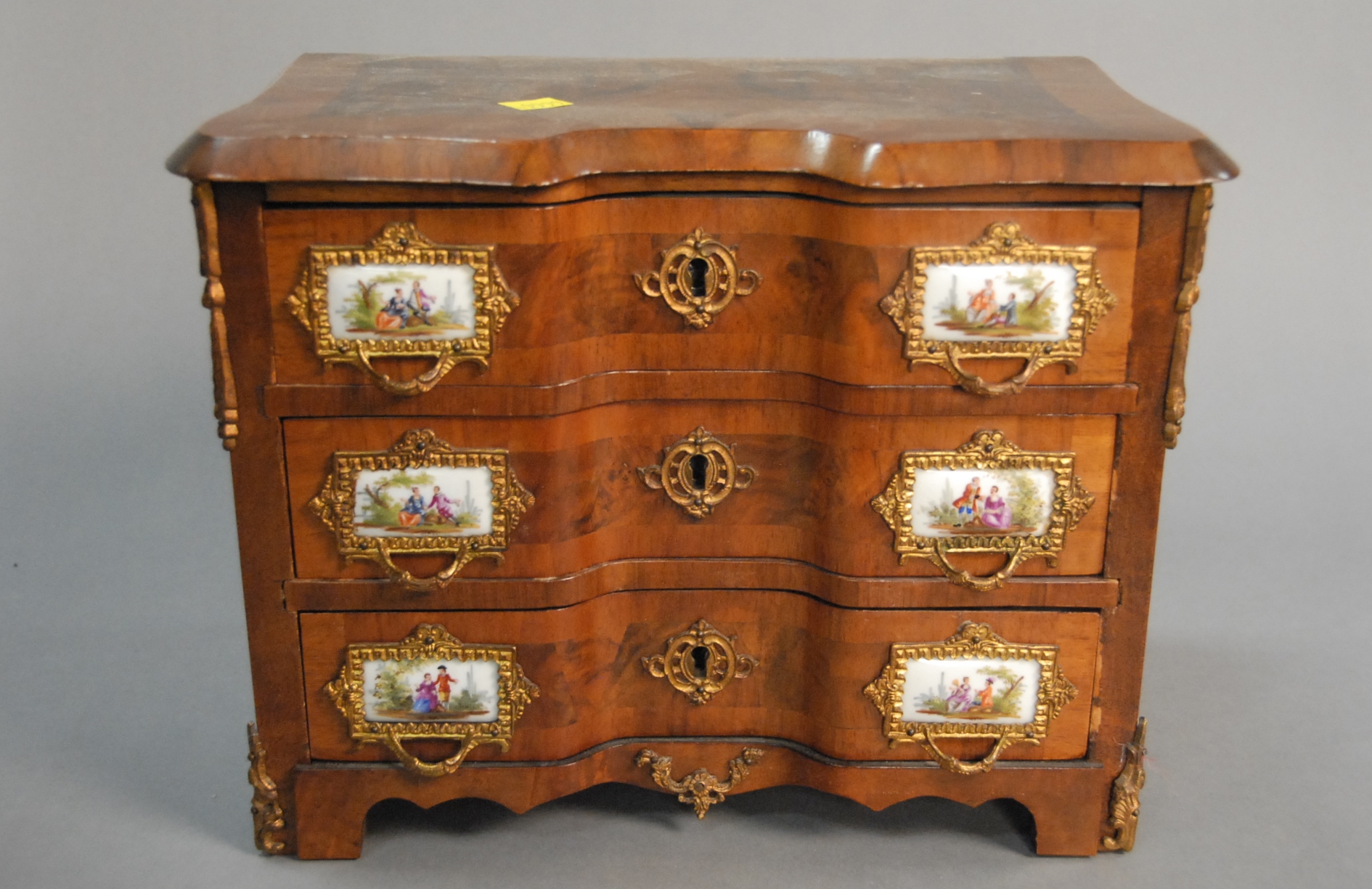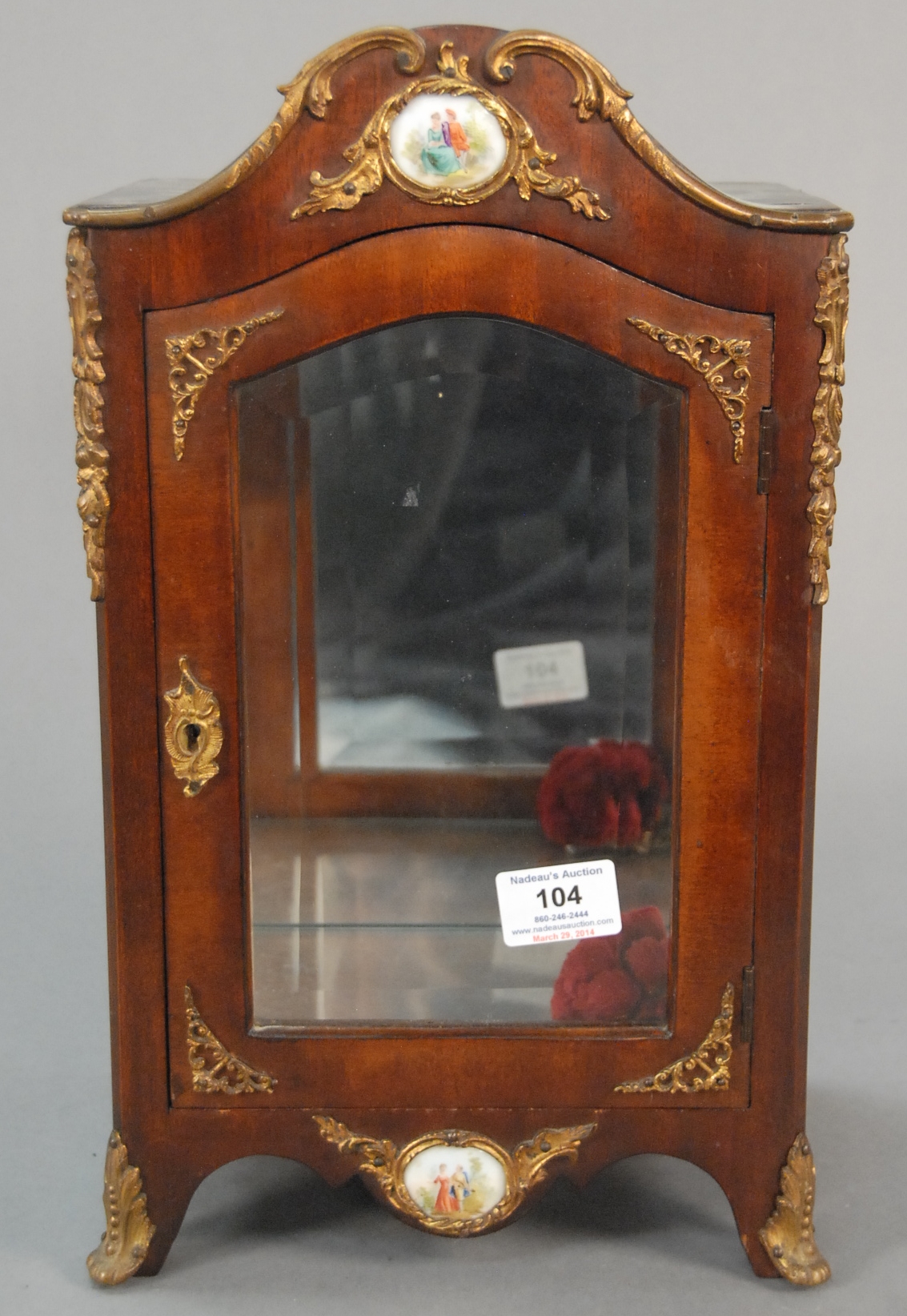 Louis XV style gilt metal and porcelain mounted walnut miniature vitrine with glazed sides and hinged door, fitted with two glass shelves, the arched cornice and shaped apron each mounted with an oval porcelain plaque with figures in landscape, 20th century. ht. 15in. wd. 9 1/2in. dp. 7in.