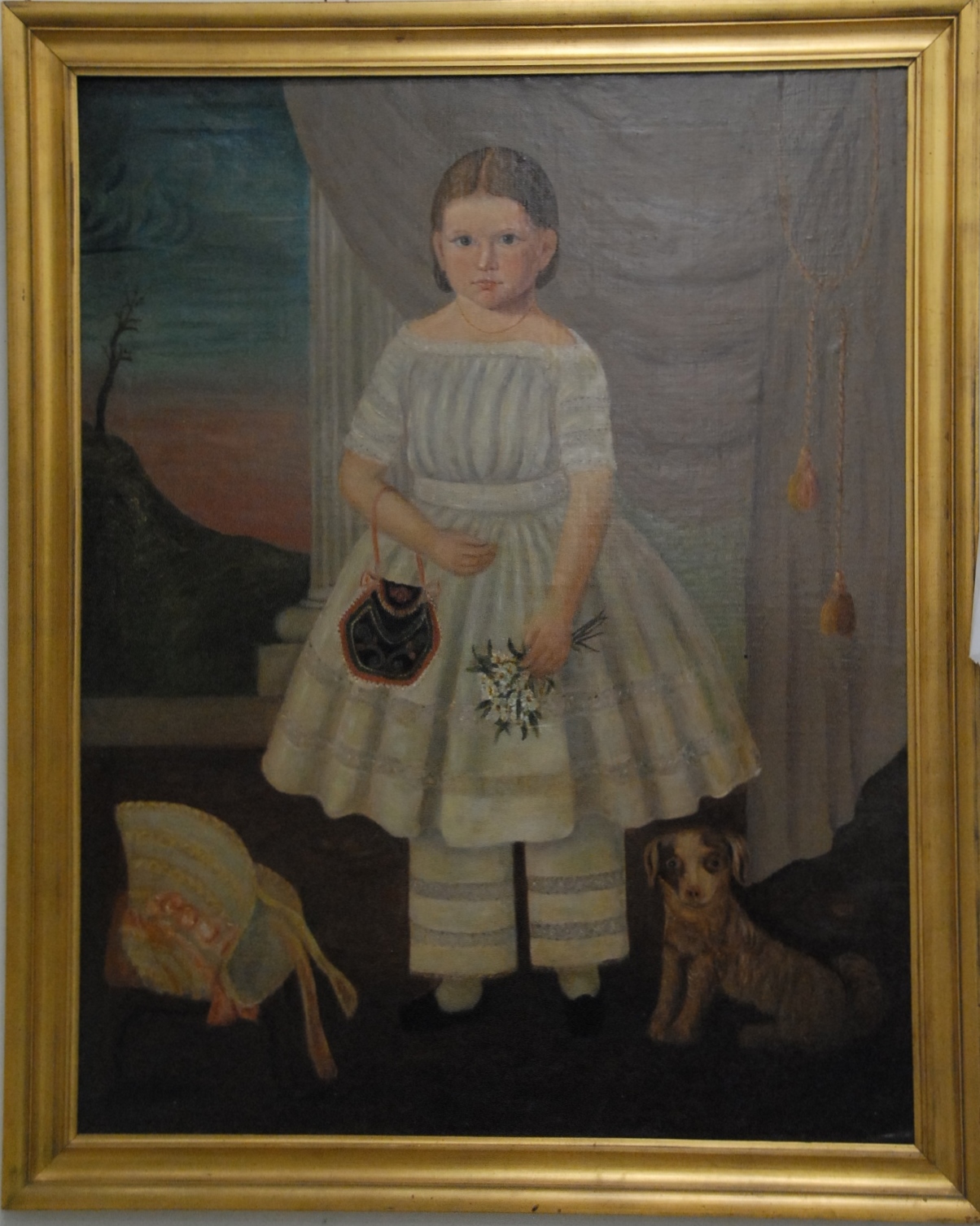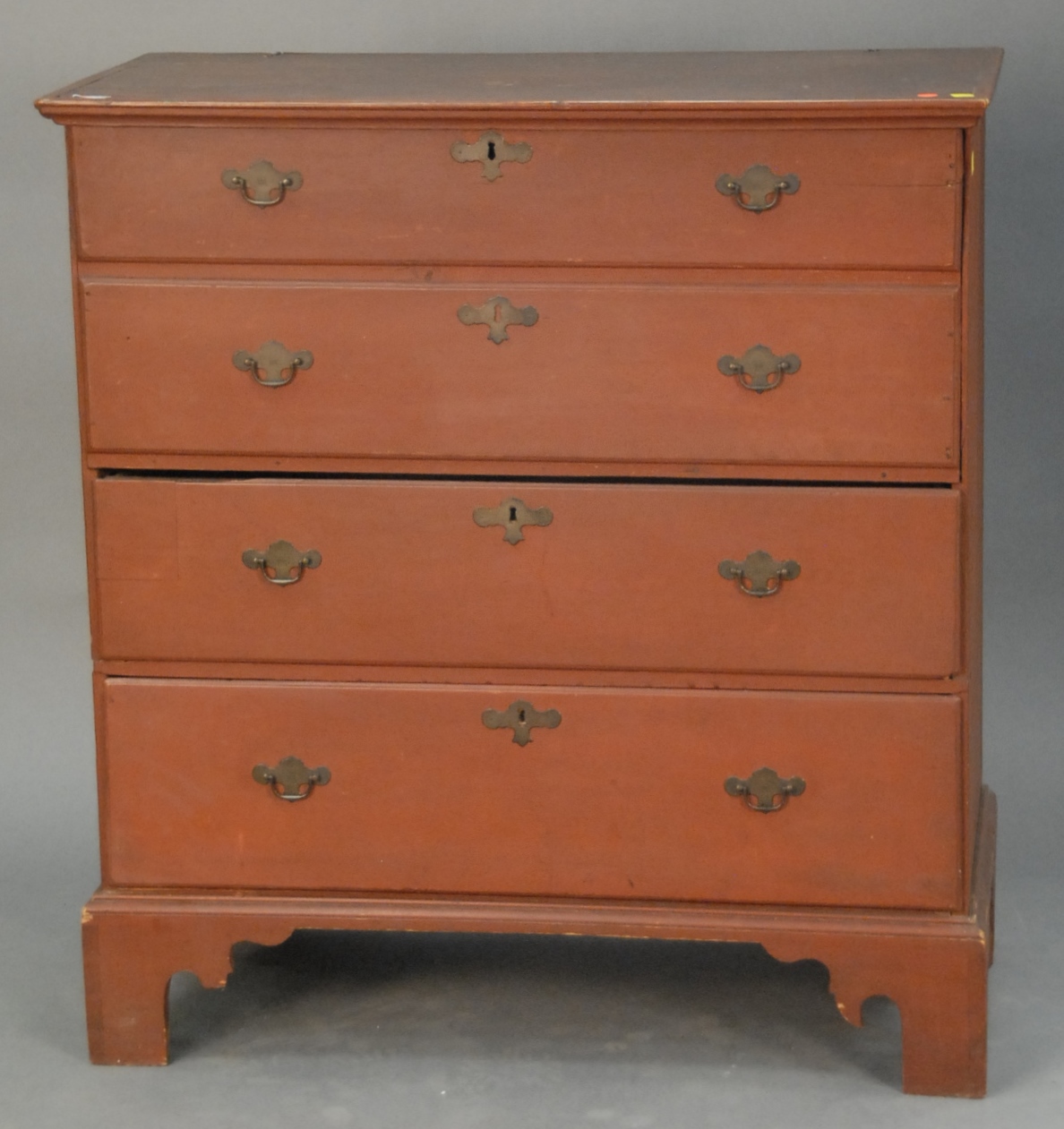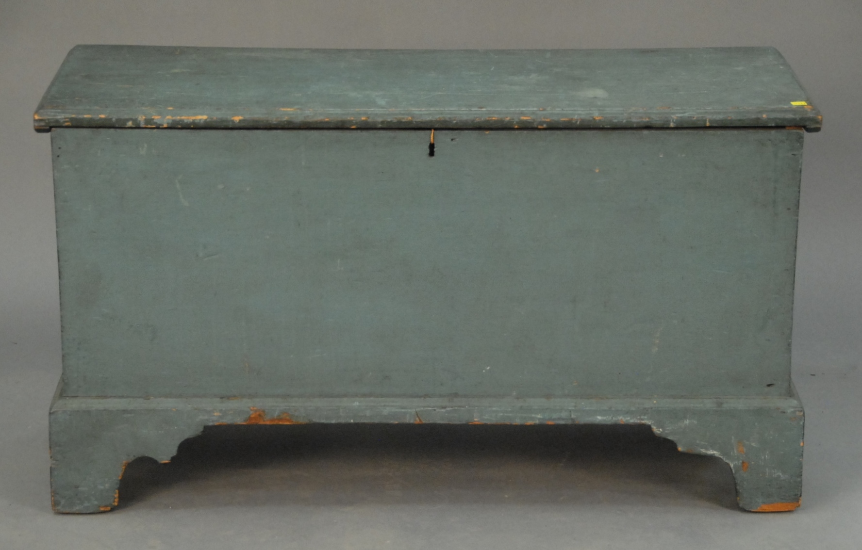 Primitive blanket chest having molded top and base with bracket feet in old blue paint with original snipe hinges. ht. 24in. wd. 43 1/2in. dp. 18in. Provenance: Being sold for Windsor Historical Society