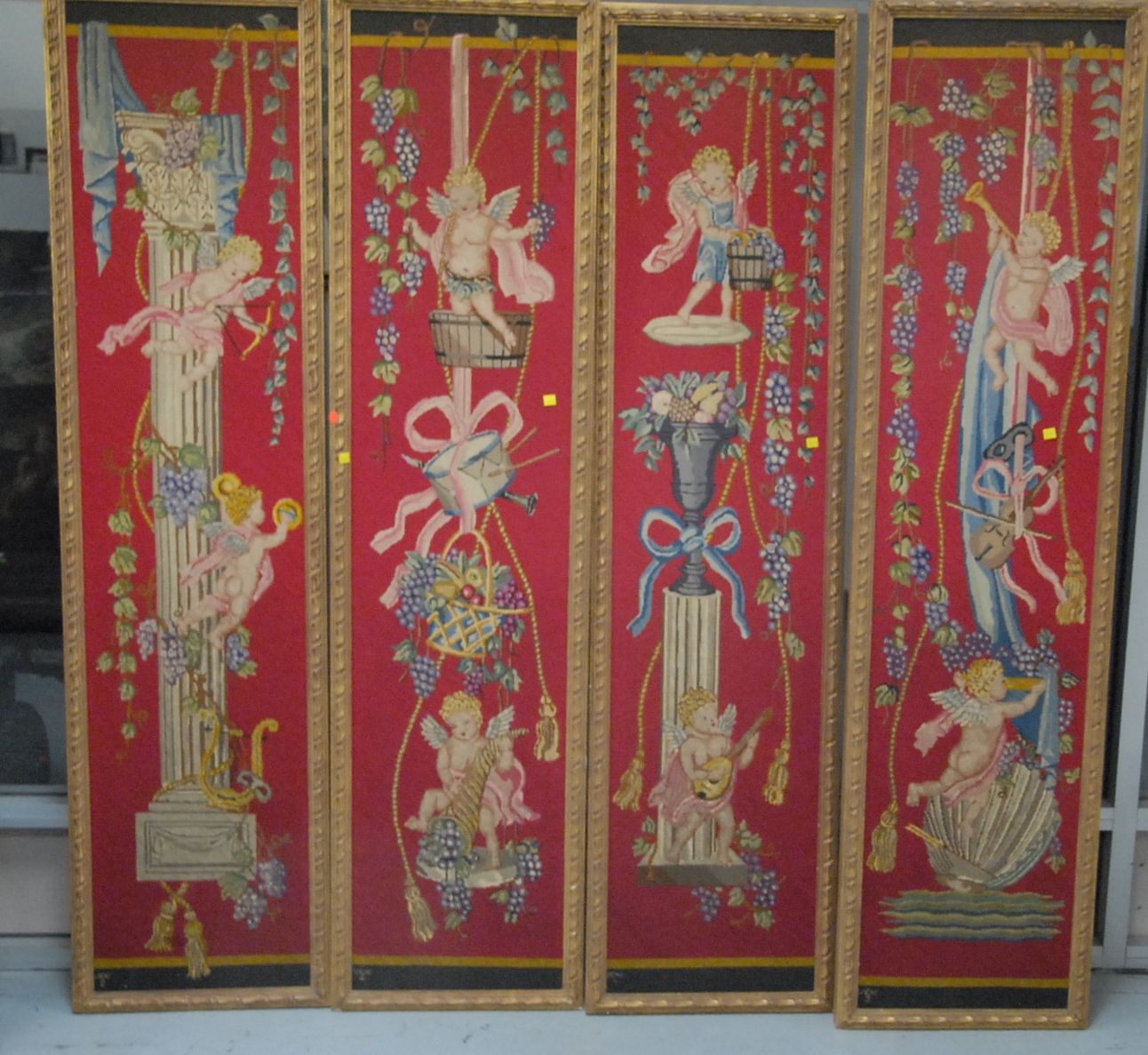 Continental Baroque carved and polychromed wood wall sconce in deep relief, centering a basin with needlework back flanked by putti with fruiting foliate decoration overall, possibly in original paint, 18th century. ht. 15in. wd. 11in.