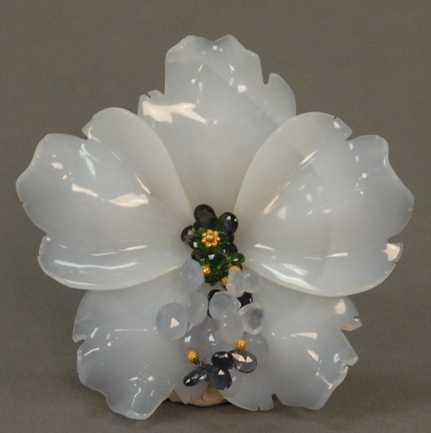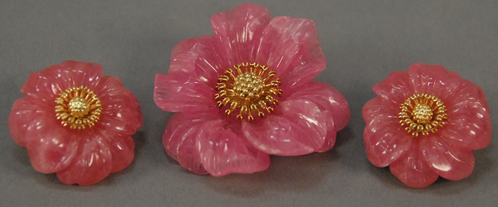 Greenleaf & Crosby three piece set of rhodochrosite and 18K gold flower jewelry with carved brooch and pair of carved clip on earrings, each set in 18K gold with 18K gold centers, marked GC for Greenleaf and Crosby. brooch: dia. 2in. earrings: 1 1/4in.