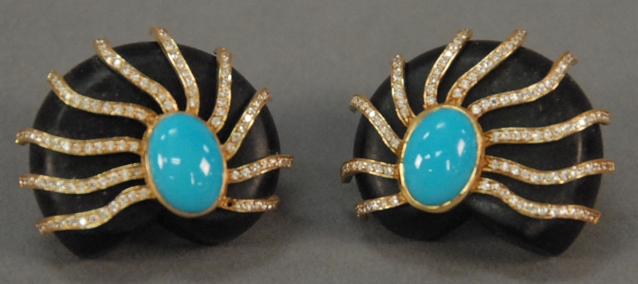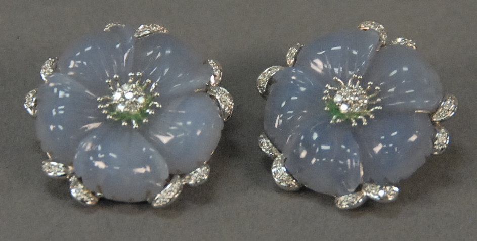 Cartier pair of platinum and diamond clip on earrings, each openwork set with ten marquis diamonds in each, flanked by approximately 88 small diamonds, diamond weight approximately 4cts. each, signed Cartier Paris. lg. 1 3/4in.