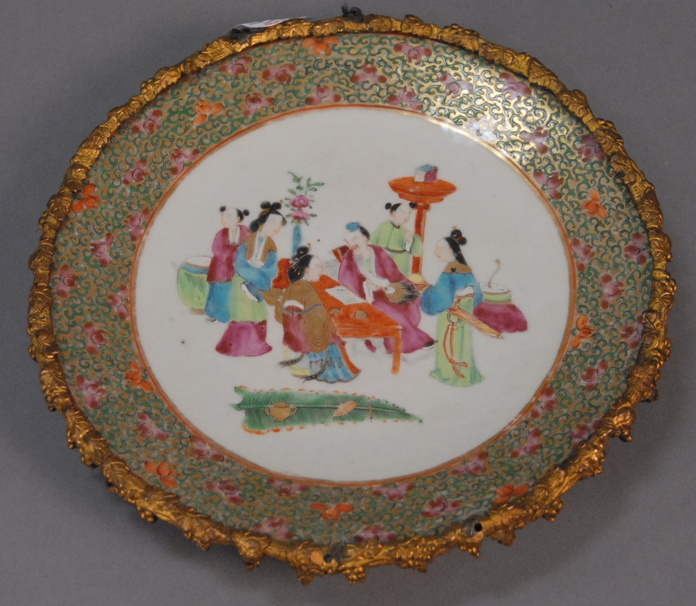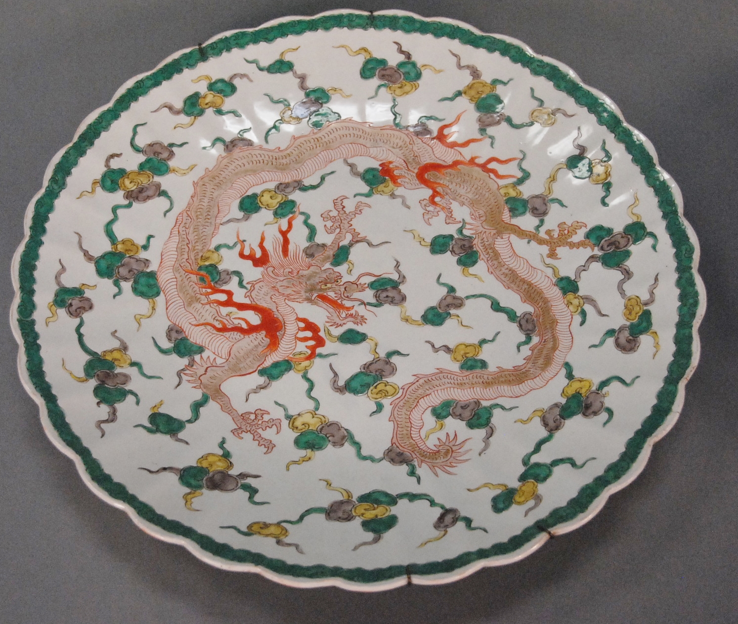 Chinese Export famille verte porcelain charger with lobed rim decorated with dragon stamped with Qianlong six-character seal mark, late 19th/early 20th century. dia. 18in.