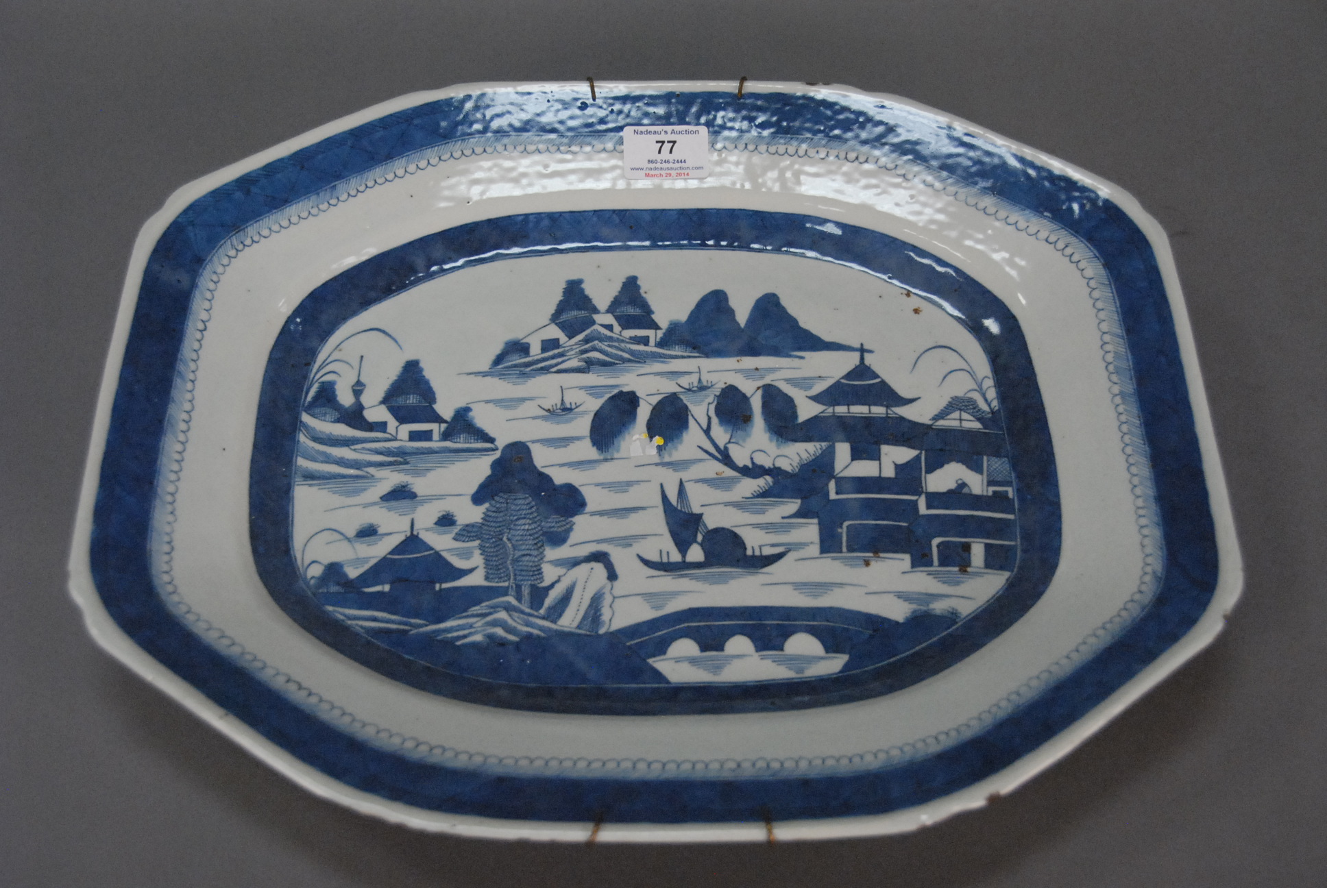 Chinese Export Canton blue and white porcelain chamfered octagonal platter, late 19th – early 20th century minor edge imperfections. lg. 17 1/2in. wd. 14 1/4in.