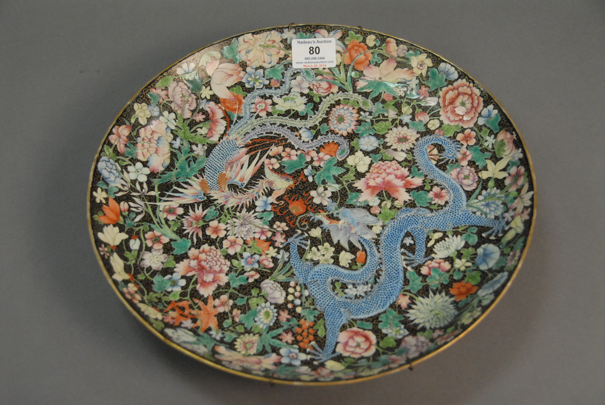 Chinese famille rose enameled ‘mille fleur’ design porcelain charger decorated with dragon and phoenix on black ground, late 19th/early 20th century. dia. 13 1/2in.