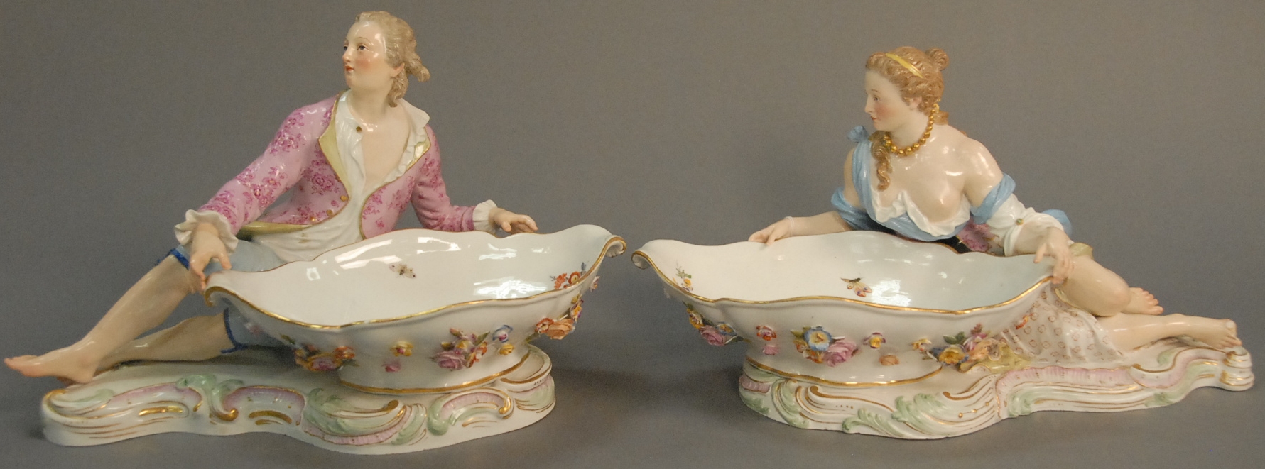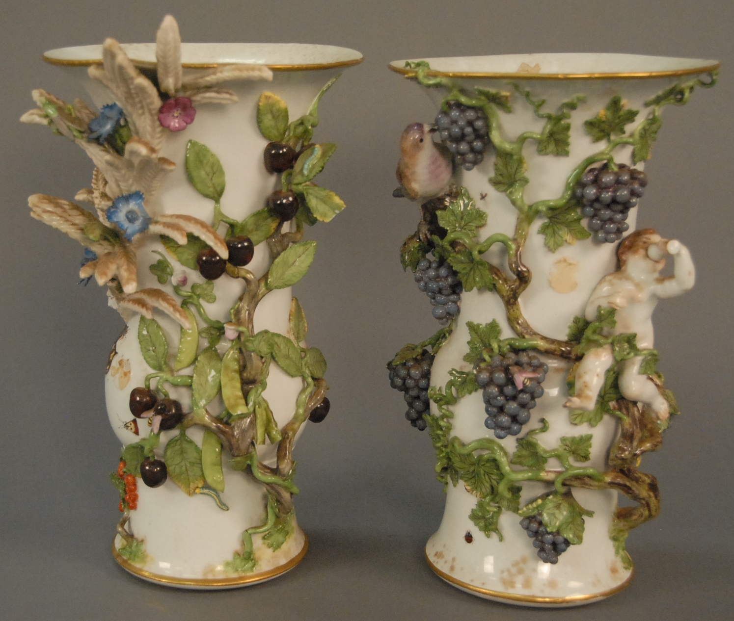 Meissen two piece vases lot to include porcelain vase mounted with three dimensional flowers and fruit and painted butterflies and bugs and vase mounted with three dimensional bird, cherub, vines and grapes with painted bugs, each marked with crossed swords, late 19th to early 20th century minor imperfections. hts. 13in.