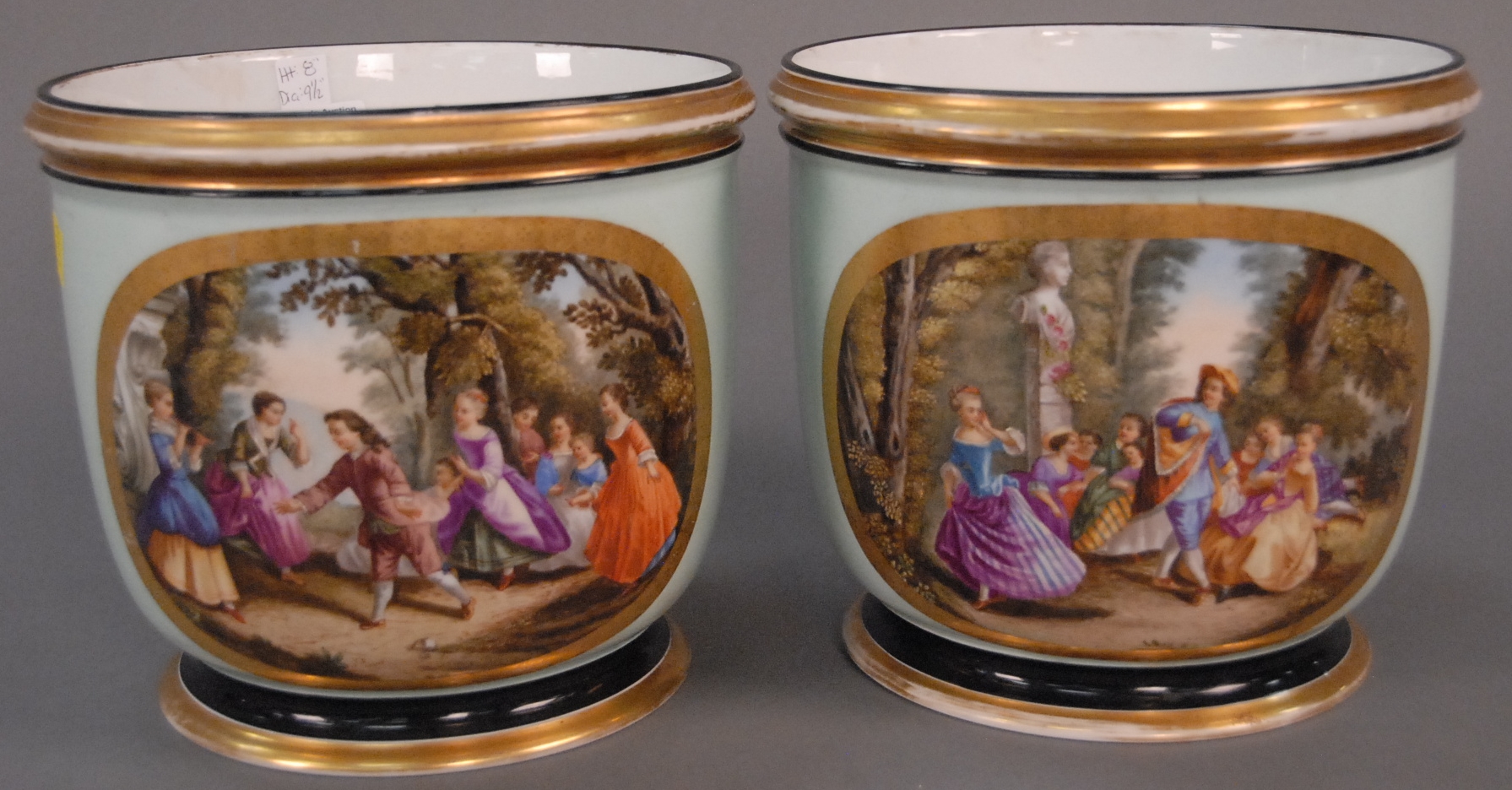 Pair of Paris porcelain jardinires, each painted with oval reserves depicting figures in early 19th century costume and at a garden party, on pale turquoise green grounds and with gilt highlights, early 20th century. ht. 8in. dia. 9 1/2in.