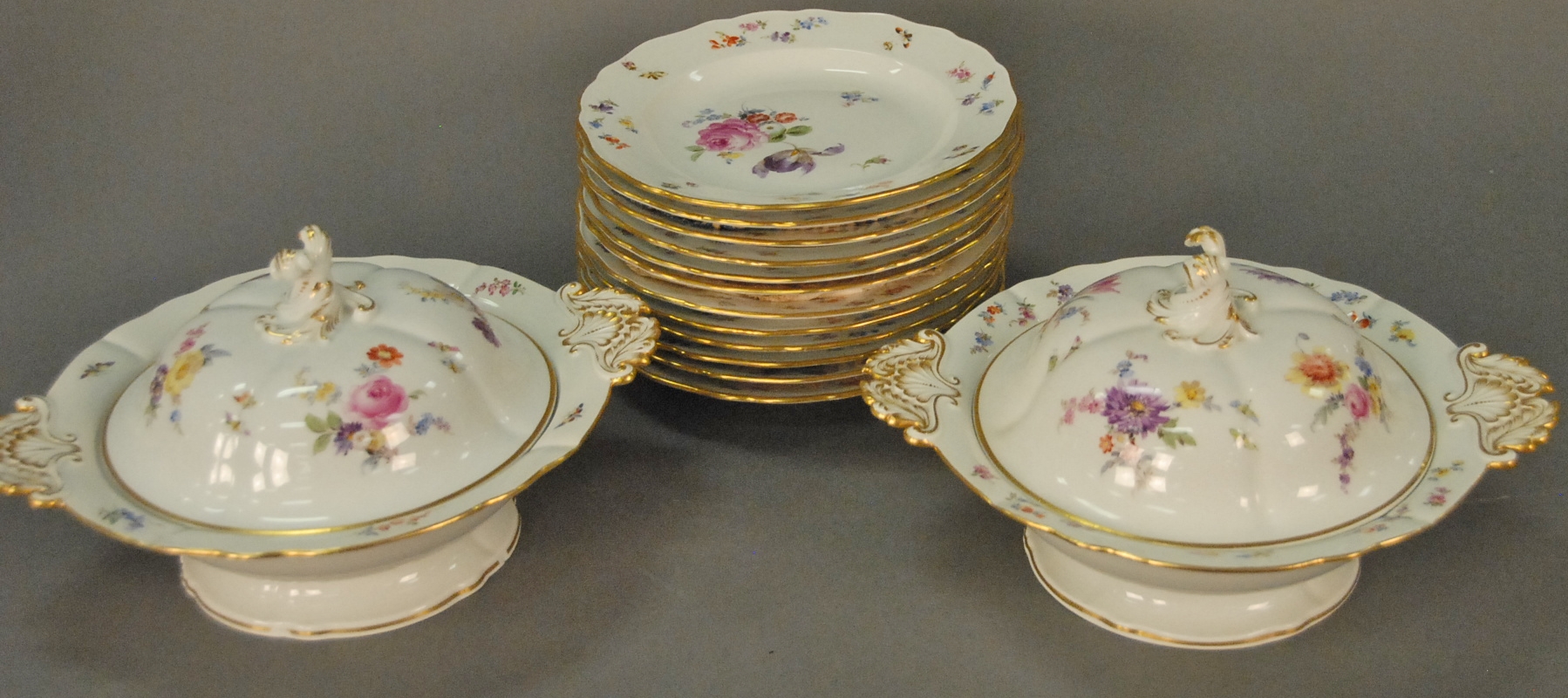Meissen fourteen piece lot including two covered vegetable dishes with handles and twelve deep plates, all with various hand painted flowers, marked with crossed swords small chips on base of one covered dish. deep plate: dia. 9 3/4in.