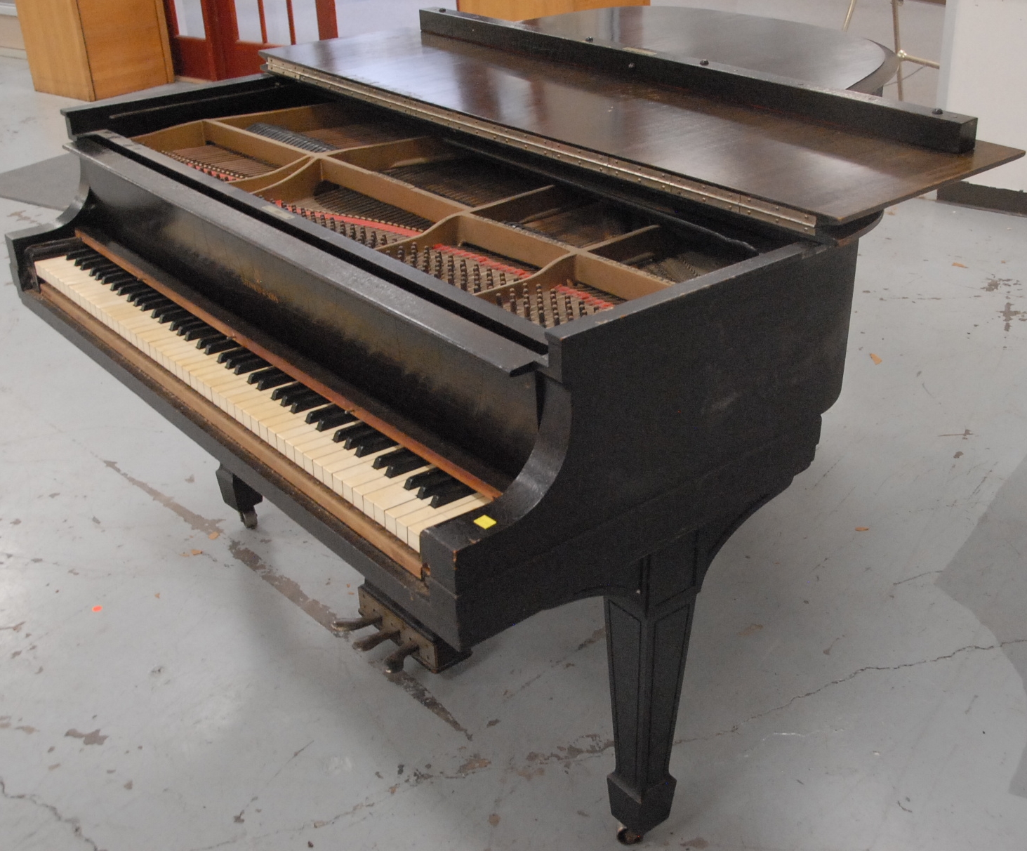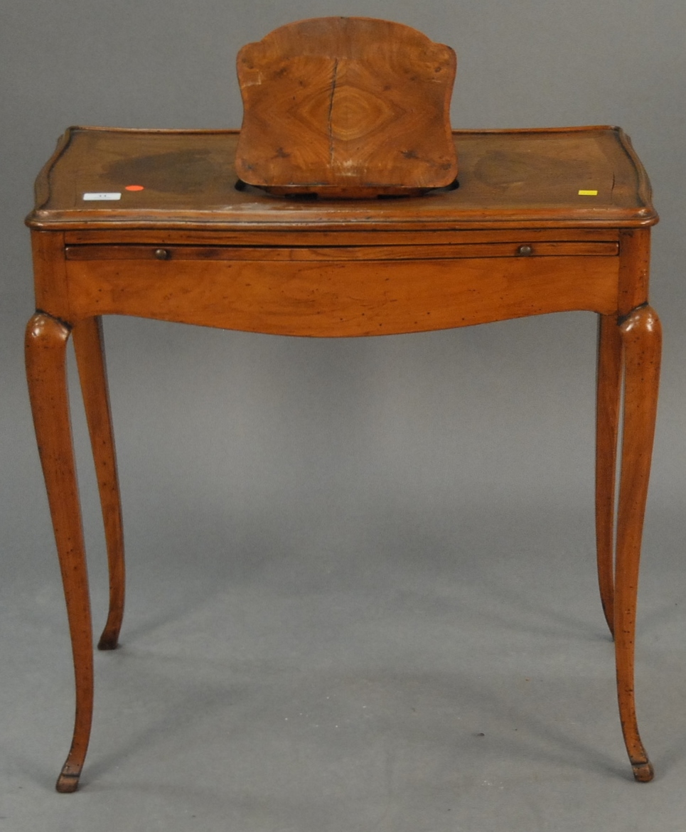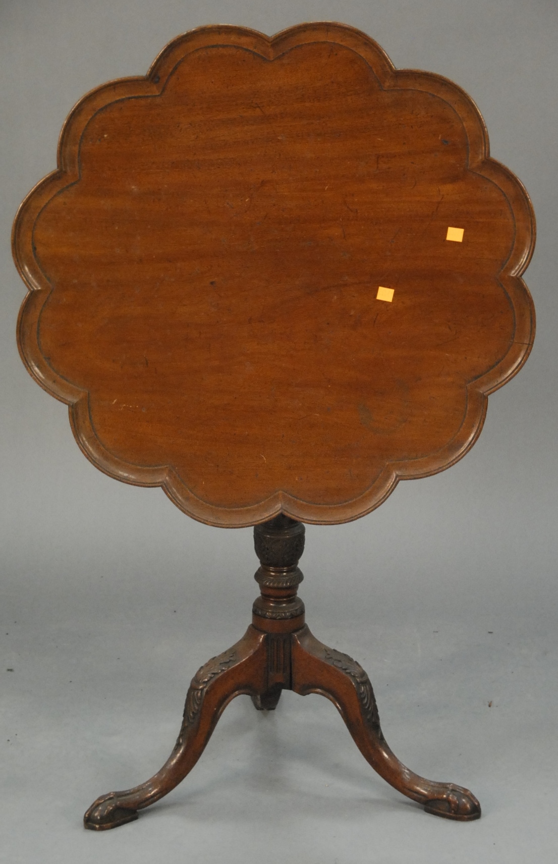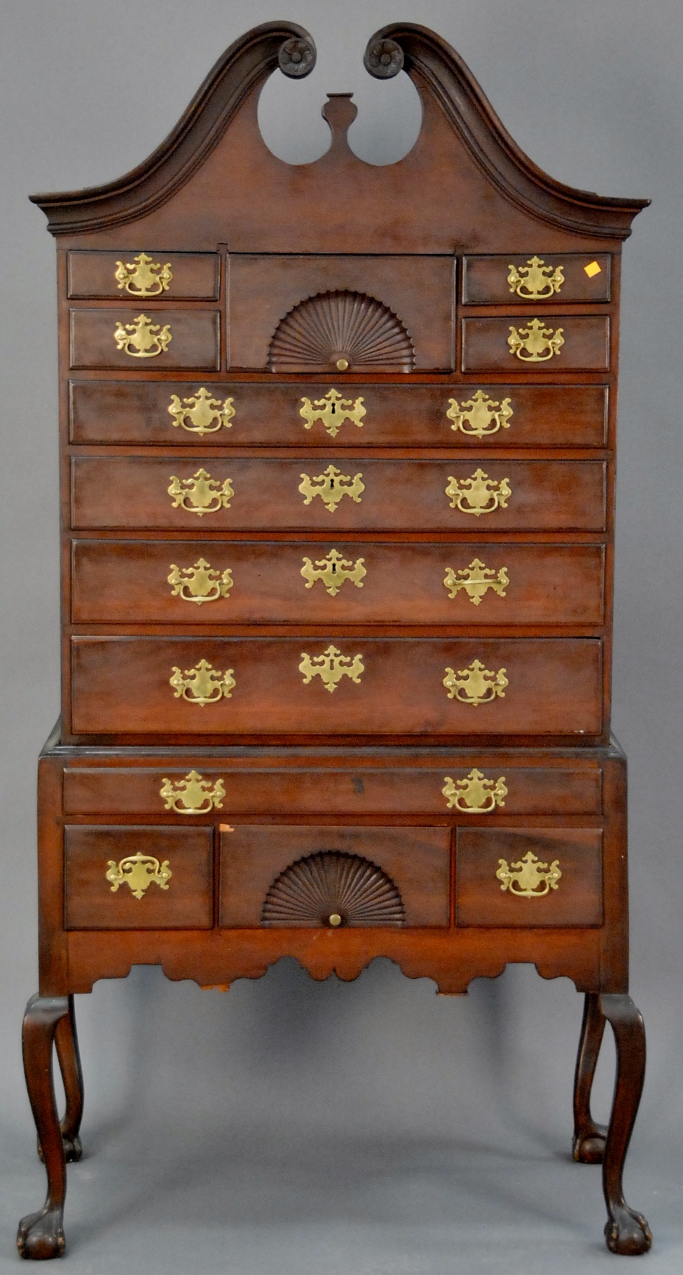 Chippendale cherry highboy in two parts, upper section with pediment top over fan carved center drawer flanked by two short drawers over four drawers on base with one long drawer over three short drawers with scalloped skirt on cabriole legs ending in ball and claw feet, circa 1760-1780 pediment top not original. ht. 77in. wd. 35in.