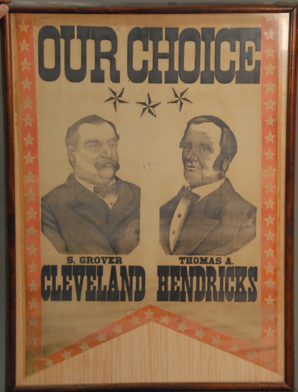 Cleveland and Hendricks campaign banner, linen banner with portraits of the 1884 Democratic standard bearers inscribed Our Choice S. Grover Cleveland, Thomas A. Hendricks 33 1/2 x 23