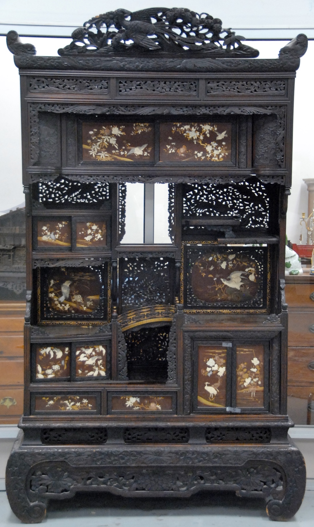 Japanese Shibayama / cabinet in three parts with bone decoration, three dimensional birds and pierce carvings with several doors and drawers. ht. 97in. wd. at base 57in.
