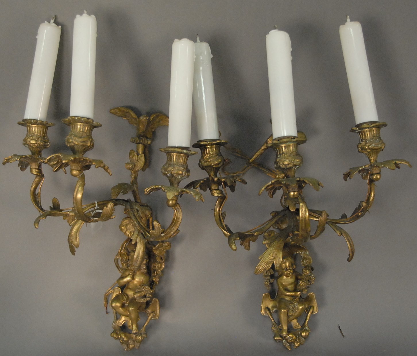 Set of four Louis XV style gilt bronze three-light bras de lumiere, each surmounted by a bird and centering a seated cherub, electrified, late 19th century. ht. 14 1/2in. wd. 12 1/2in.