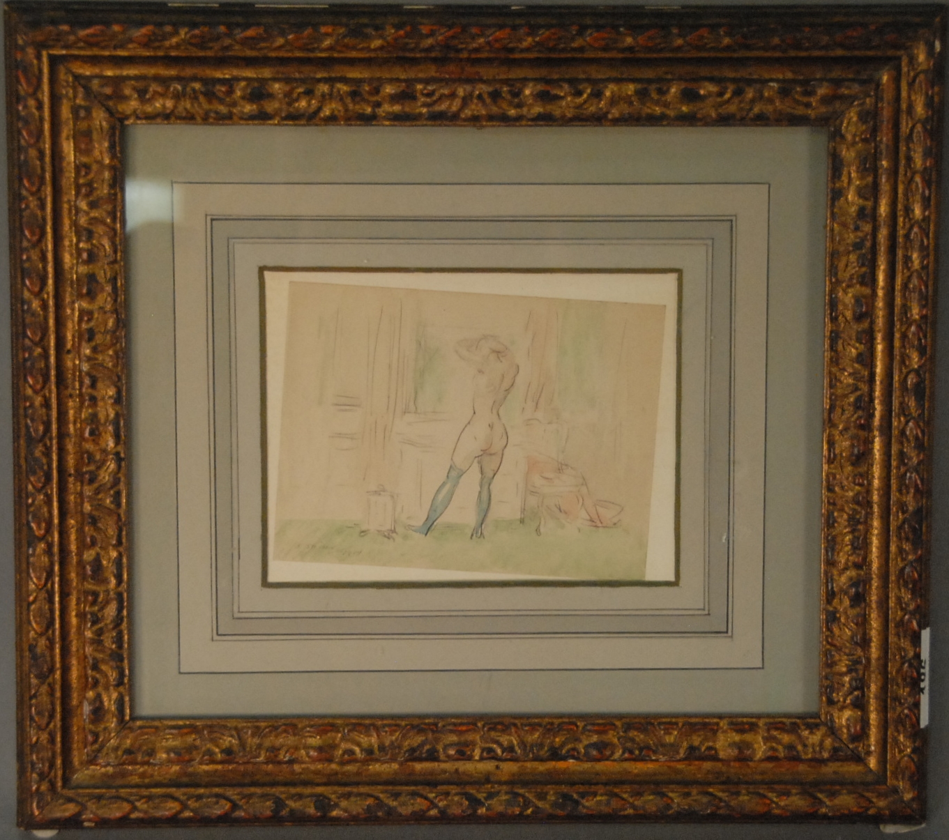 Everett Shinn American, 1876-1953 GIRL BEFORE MIRROR watercolor on paper no. 33 signed lower left E. Shinn 1914 labels on verso 5 1/2 x 4 1/2 framed 12 1/2 x 13 3/4