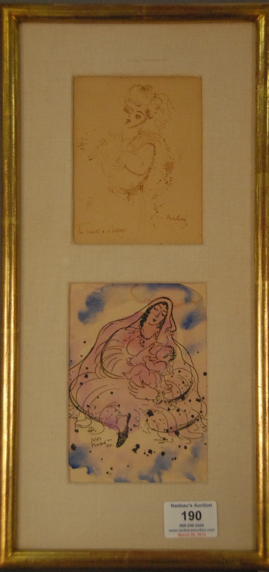 Reuven Rubin 1893-1974 two drawings in one frame watercolor and ink on paper presentation inscription ‘to Vicki and Larry’ each signed Rubin 4 3/4 x 3 3/4 double-framed 16 x 8