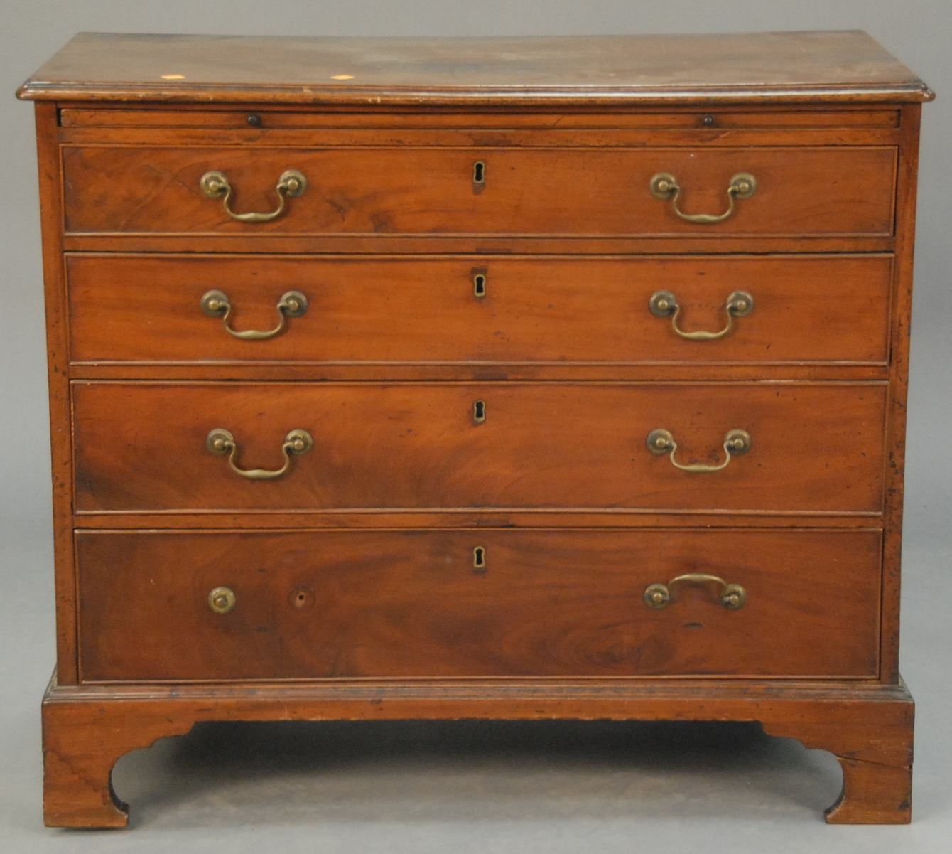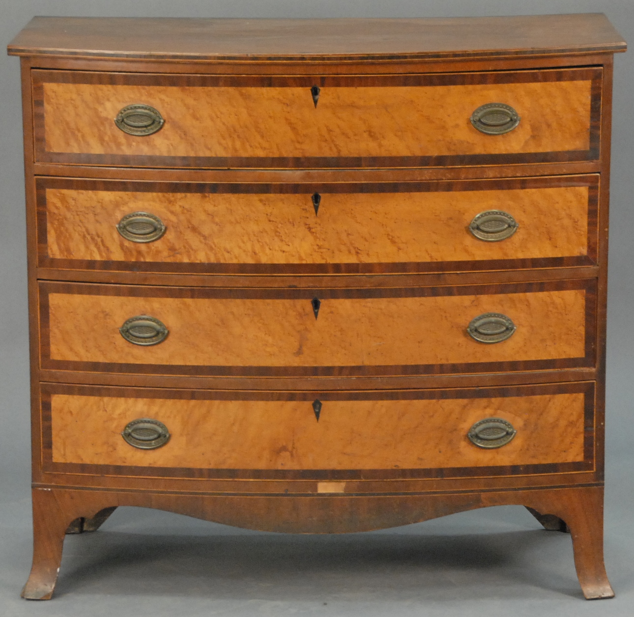Federal mahogany bow front chest with four figured maple drawer fronts with mahogany ba nded inlays all set on flared French feet with original brasses, circa 1790-1810. ht. 39in. wd. 41in. dp. 18 1/2in.