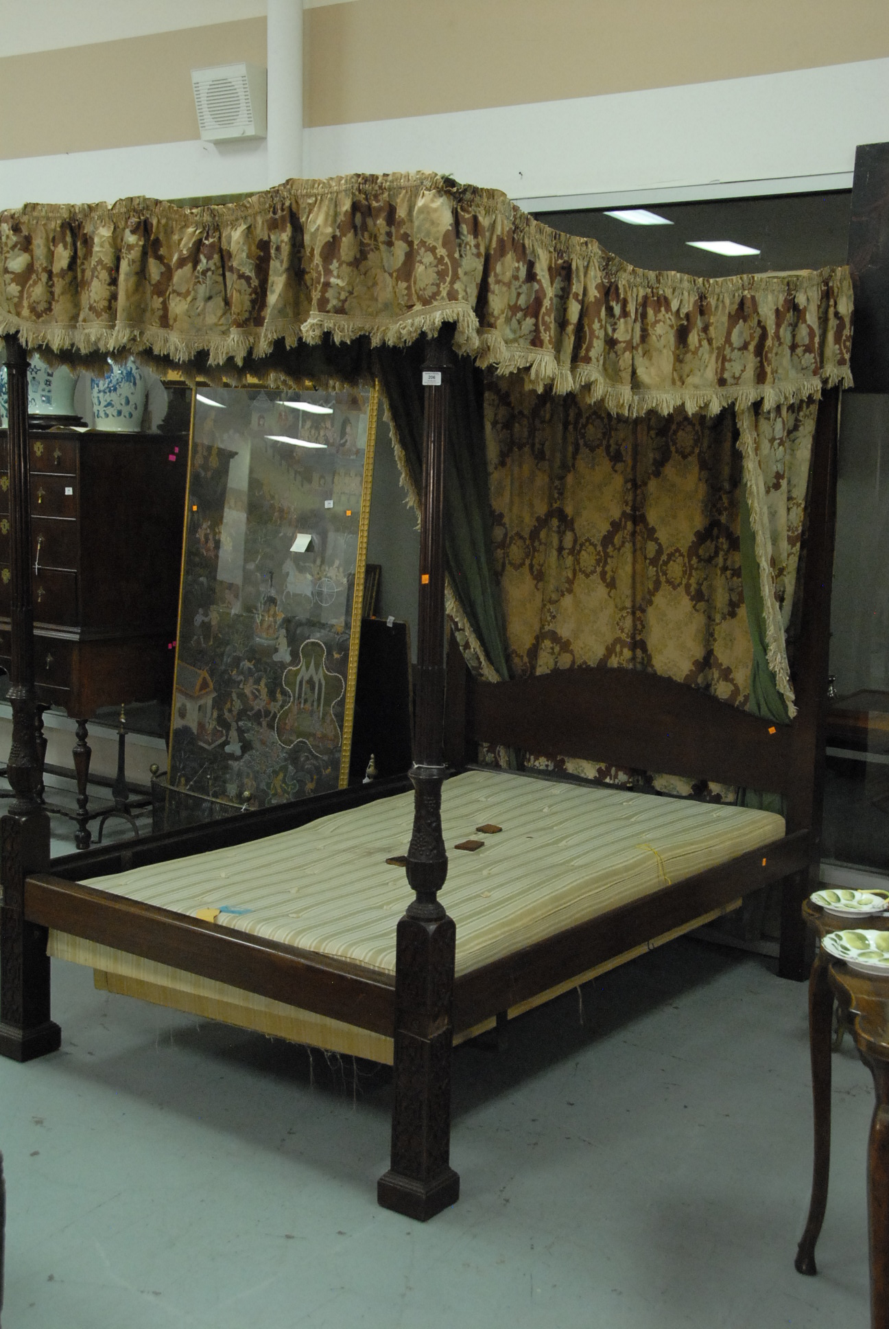 Custom handmade four post canopy bed having tall reeded and carved posts with Chinese Chippendale blind fretwork carving along with framed cloth canopy and curtains. ht. 7ft.