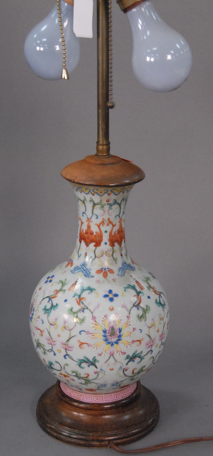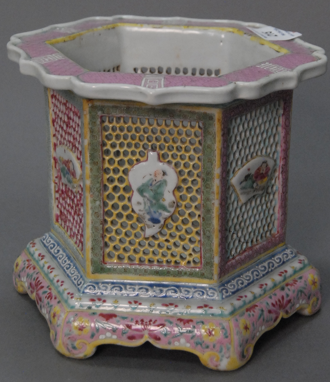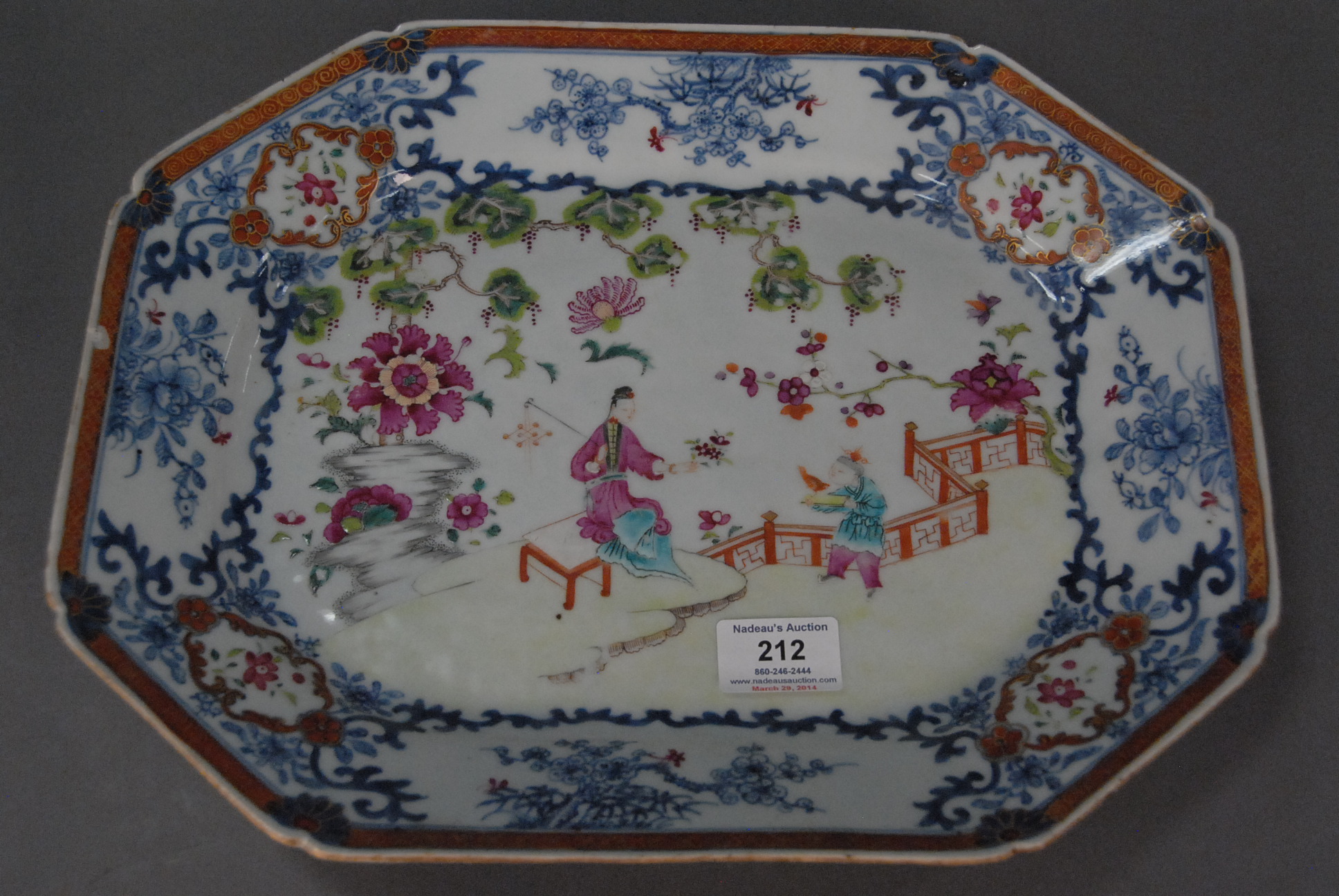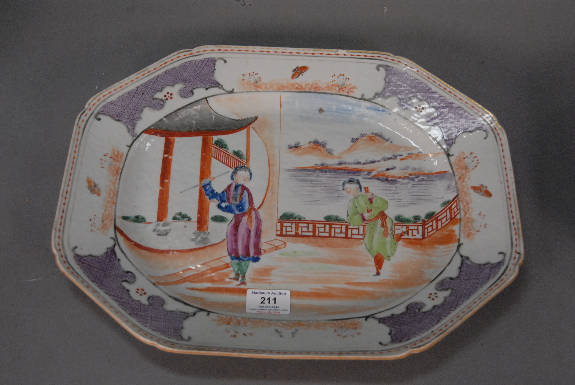 Chinese Export porcelain chamfered octagonal platter in tones of puce, iron-red, and chartreuse, late 19th century some overall wear. lg. 16in. wd. 13in.