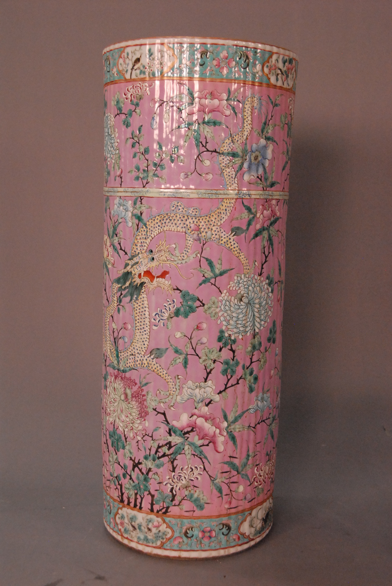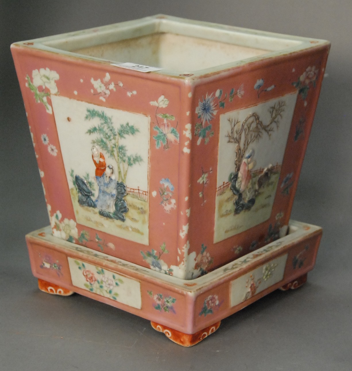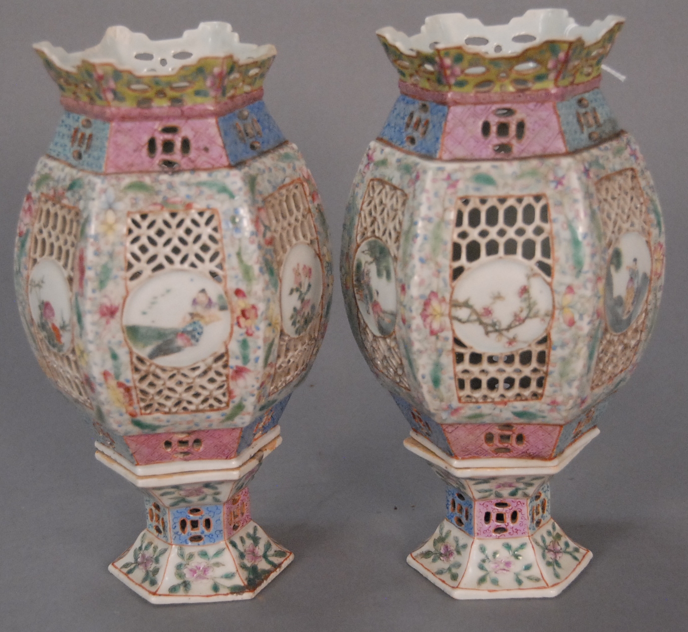 Pair of famille rose bride’s lanterns with figural and floral cartouches on reticulated panels, China 18th/19th century damage to both crowns. ht. 10 1/2in.