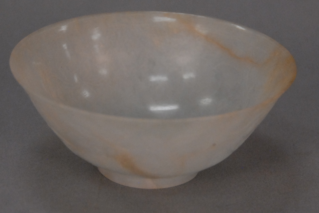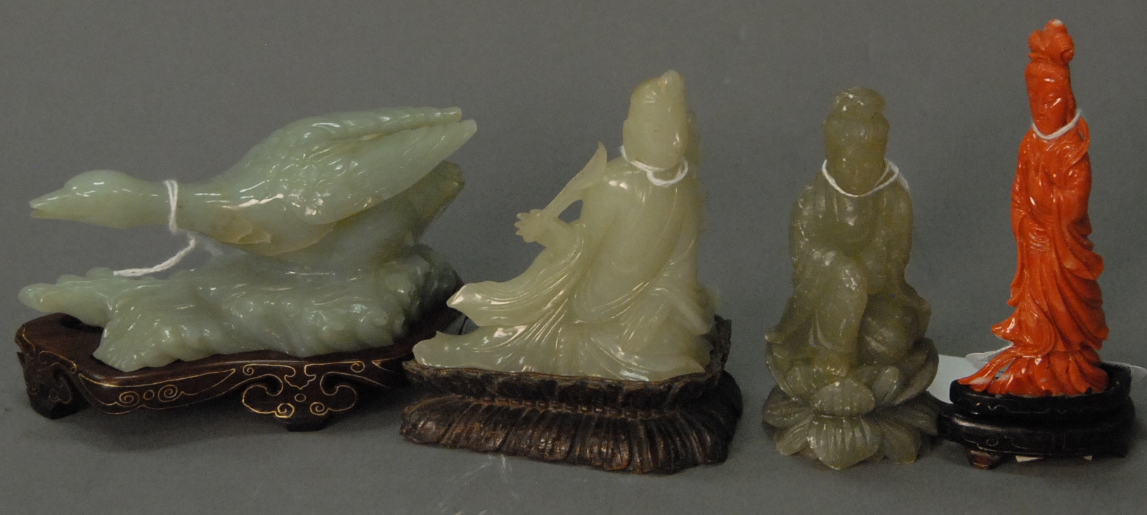 Four piece lot to include celadon jade Guanyin with fitted wood base ht. 3 1/4 in. celadon jade goose with fitted inlaid base lg. 4 3/4 in. stone Guanyin ht. 4in., and carved coral deity, all China, 20th century.