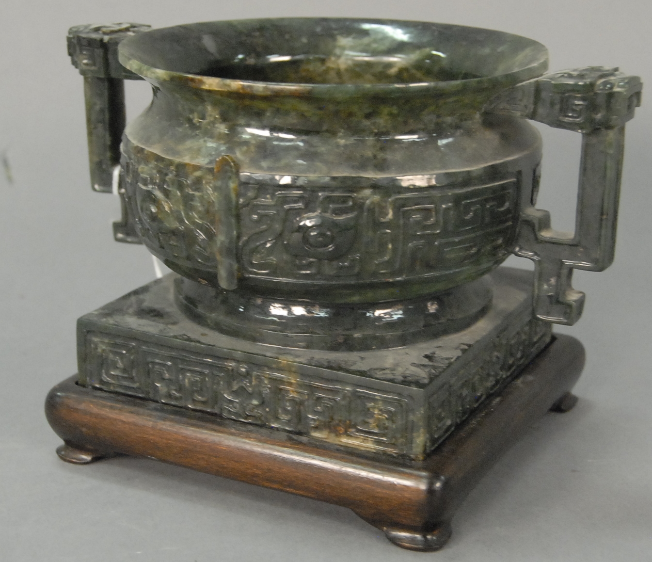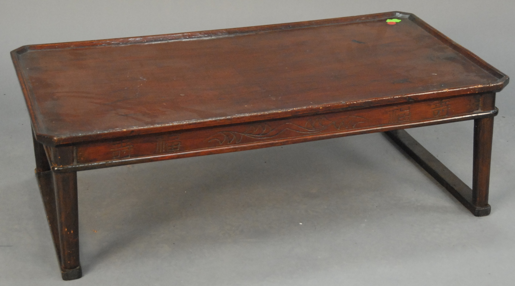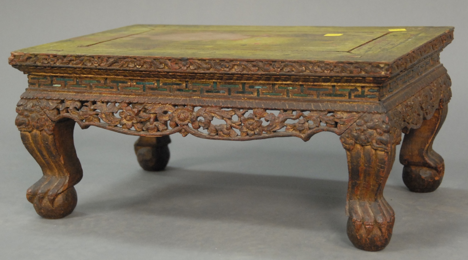 Chinese teak stand with carved edge and small green mirror pieces on carved legs with claw and ball feet, retaining some original gilt decoration, probably 18th century. top: 12 x 18