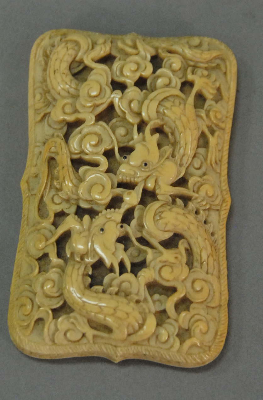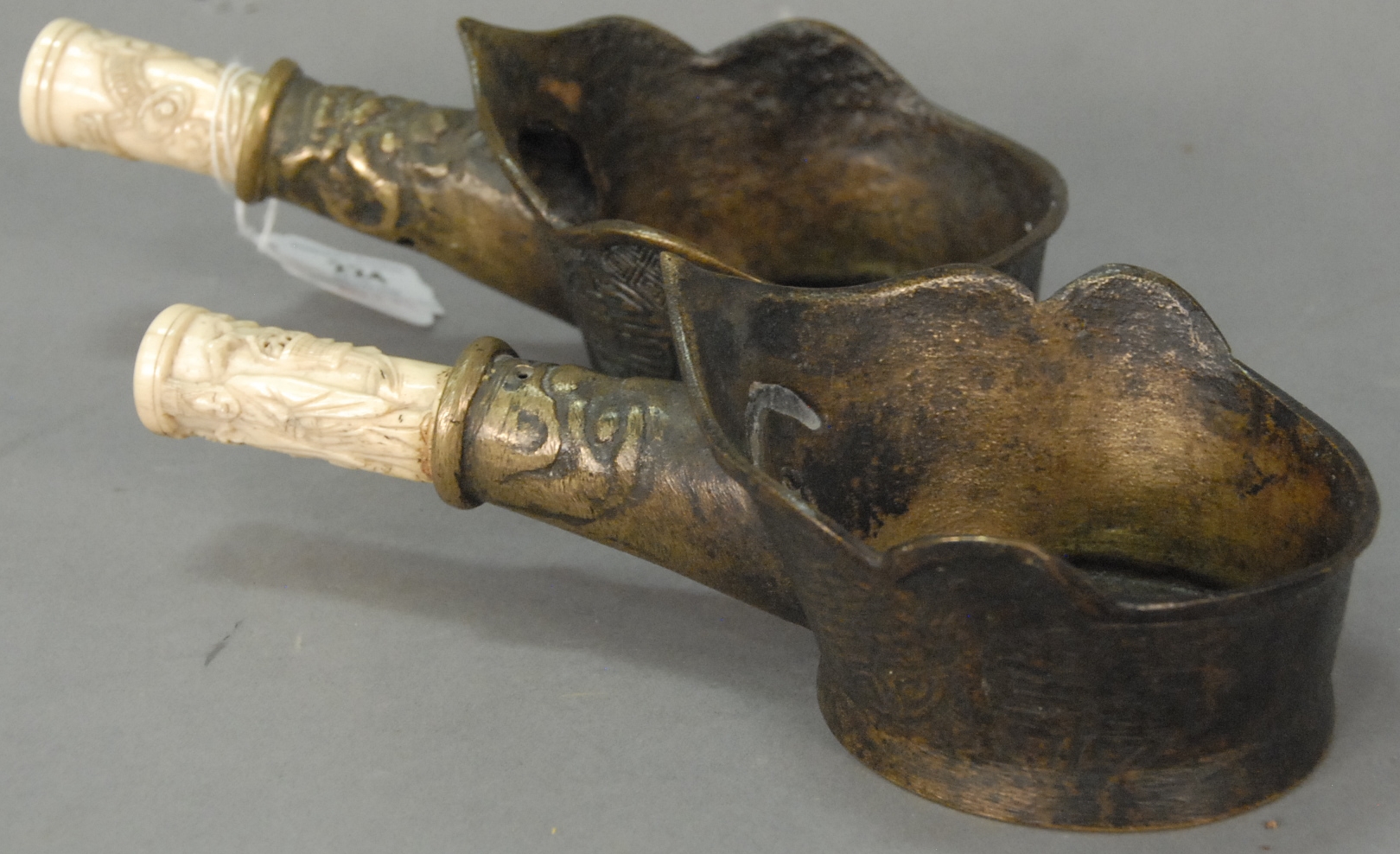 Pair of brass and bone handled heating cups the brass body decorated with Lu symbol and bone handles carved with dragons, China, 19th century. lg. 8 1/2in.