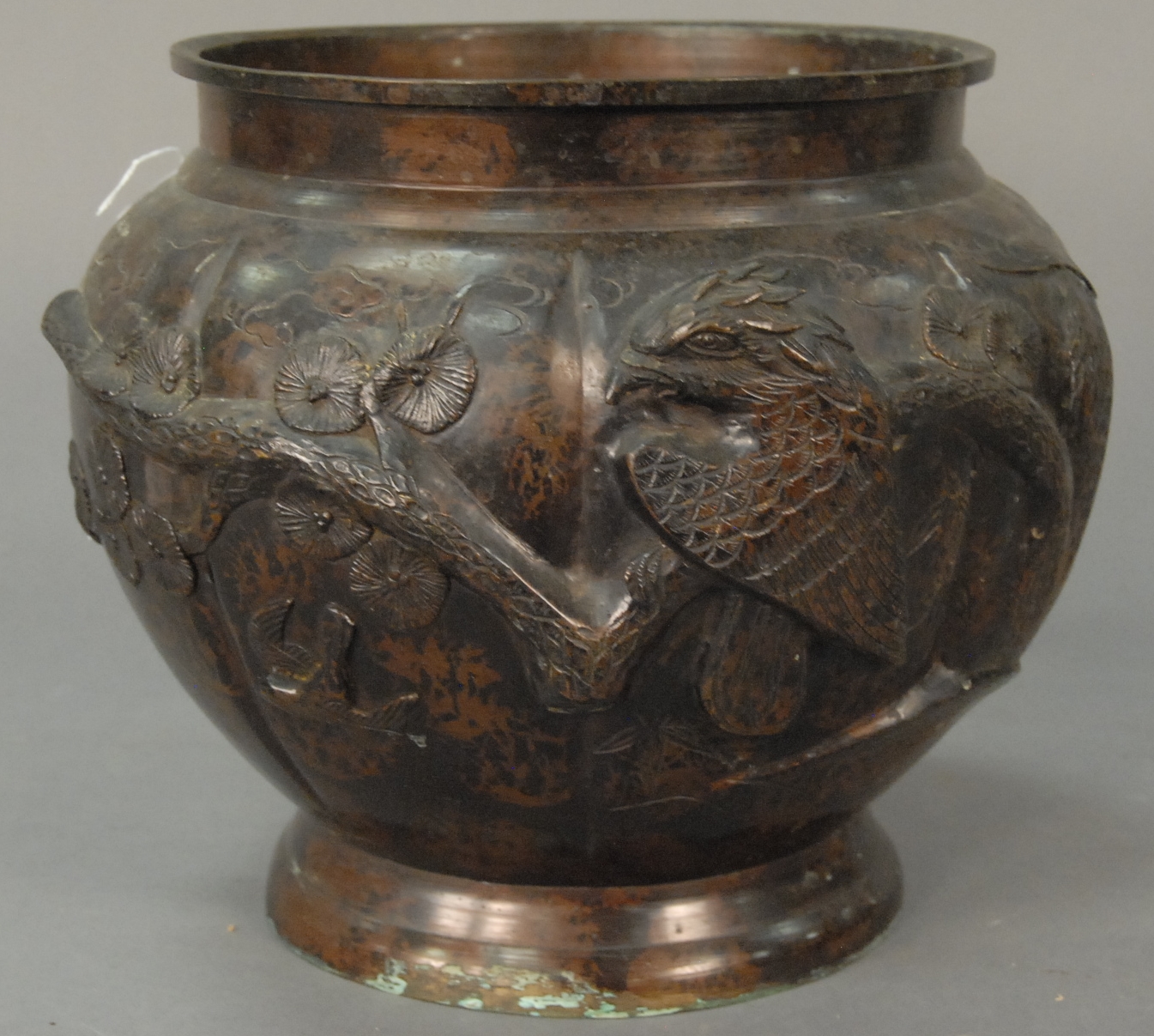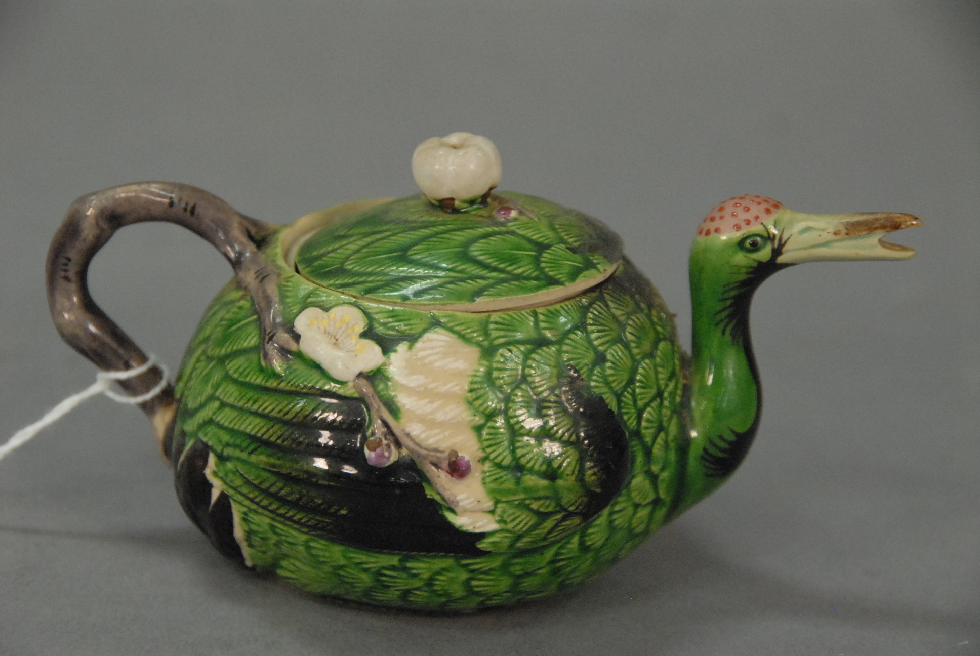 Miniature earthenware tea pot in the shape of a crane with overall carved feathers in green glaze, decorated with prunus blossoms and branch handle, spout is beak, China, 20th century. ht. 2 1/2in.