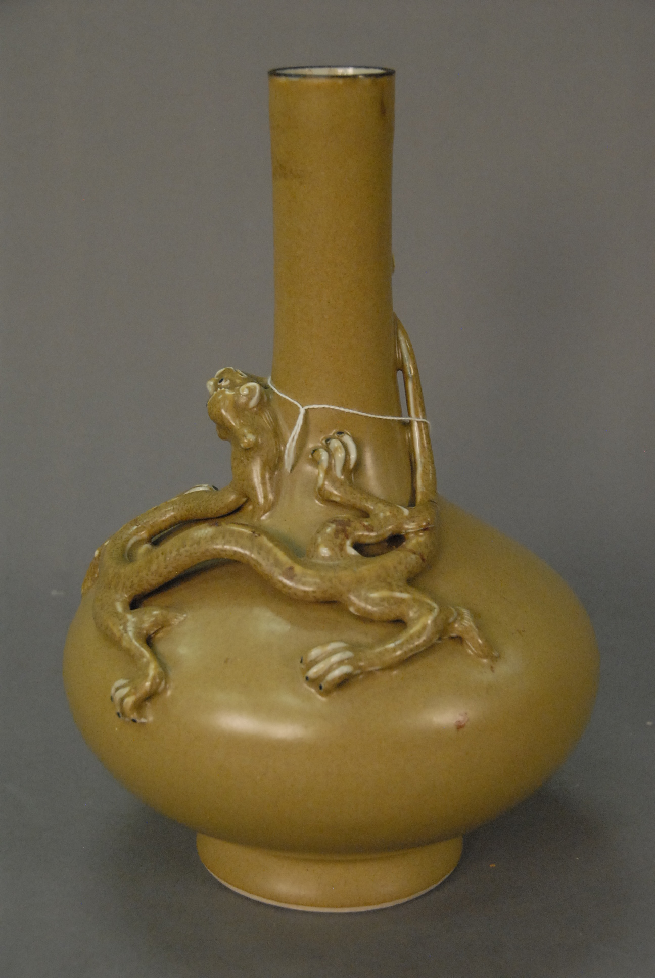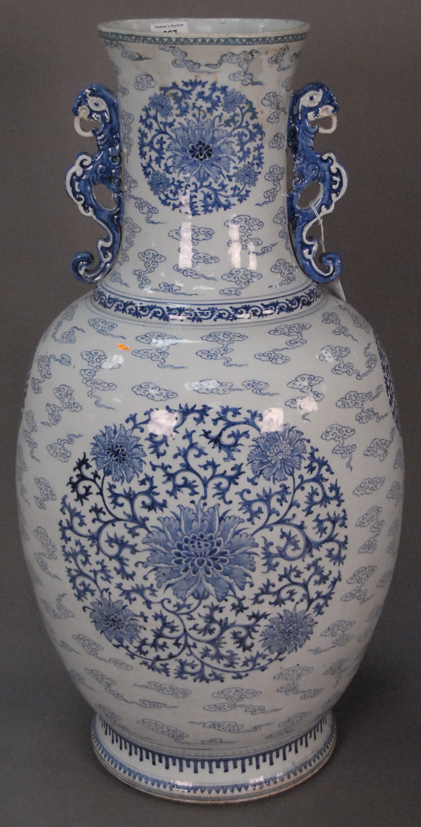 Large blue and white conical vase, Jiaqing/Daoguang, with stylized dragon handles and central stylized chrysanthemum medallions and clouds in 18th century style, China, probably 18th century old repair to mouth rim. ht. 30in.