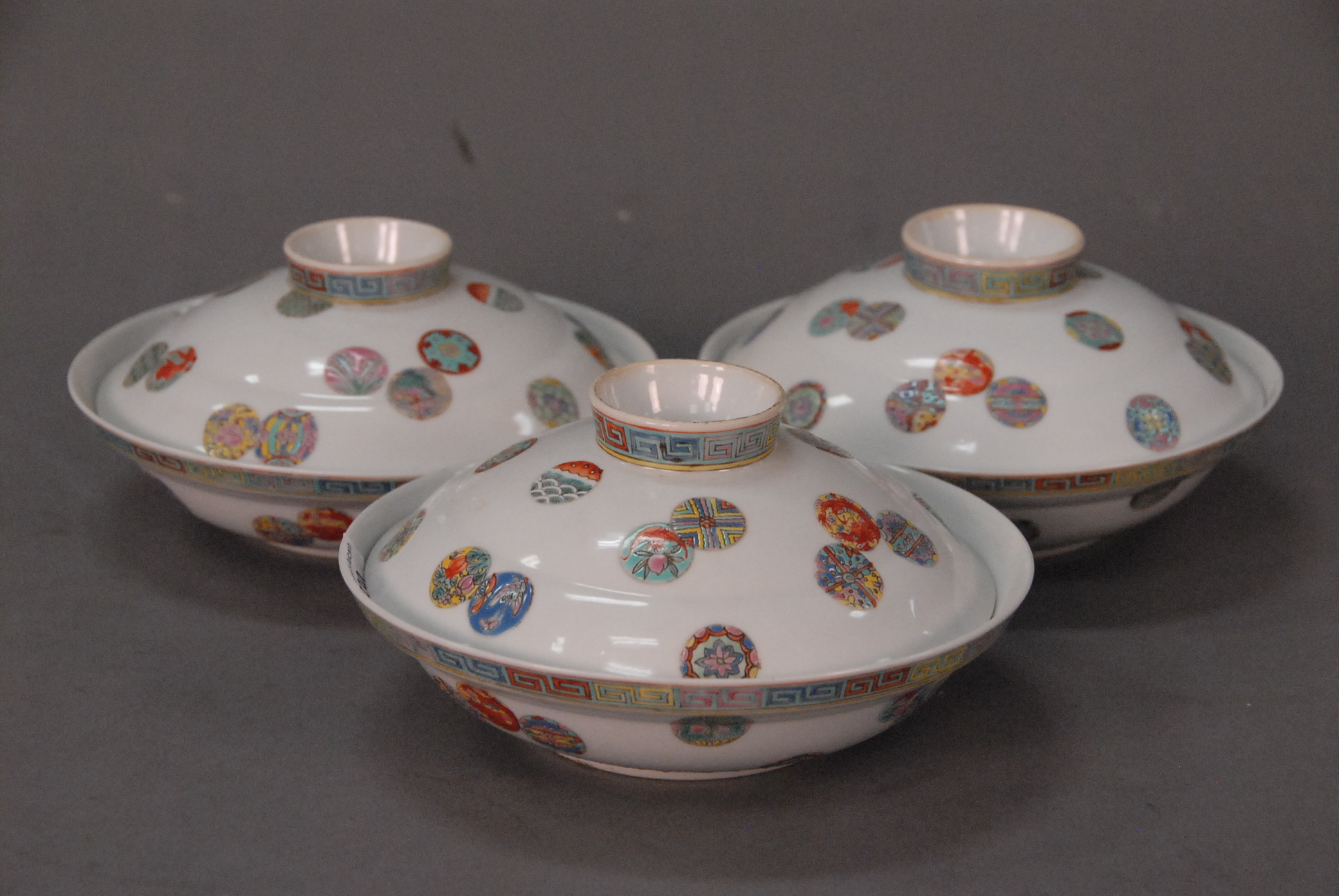 Set of three famille rose covered dishes decorated with enameled circles, six character Guangxu marks and possibly of period, China, 19th century. dia. 6in.
