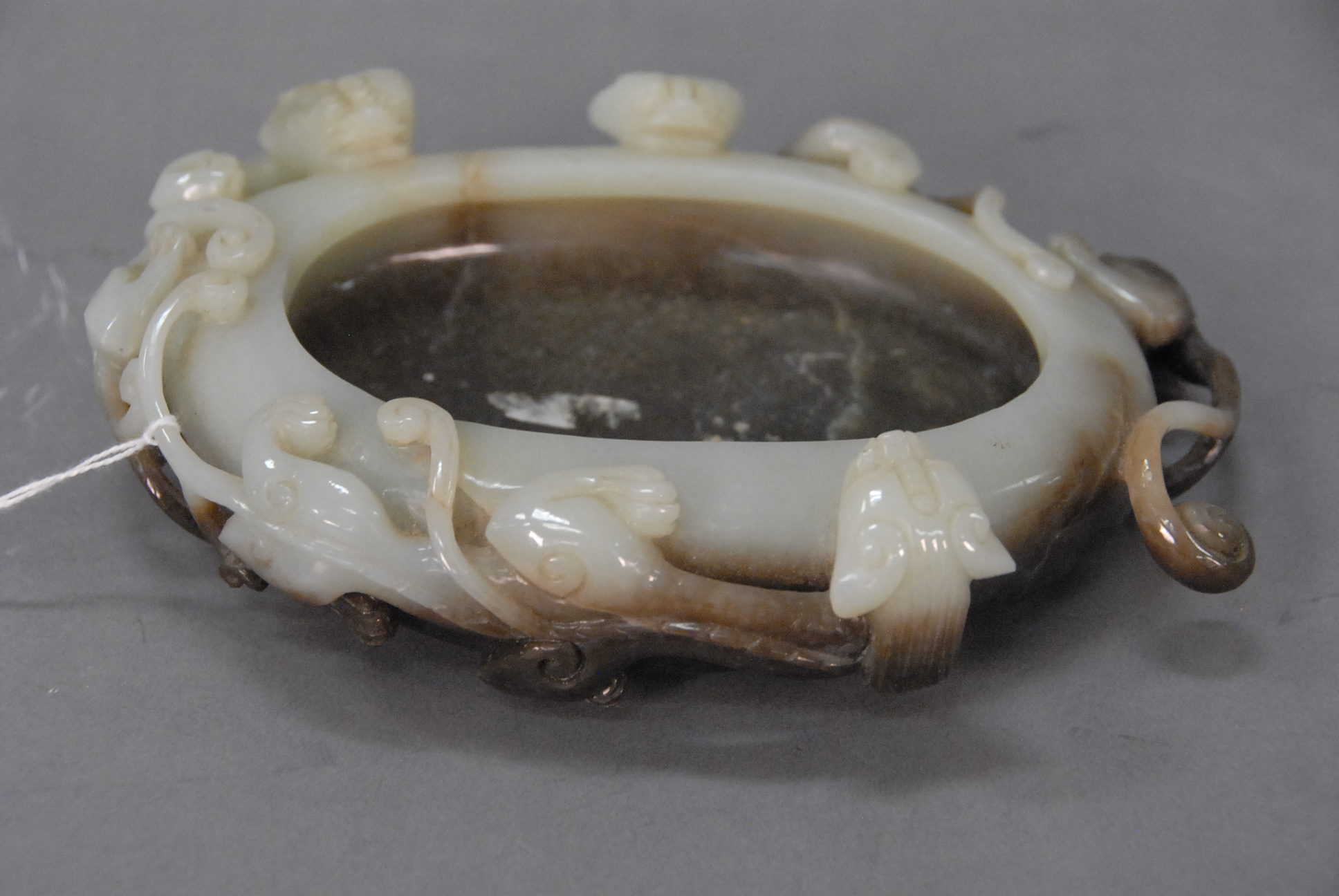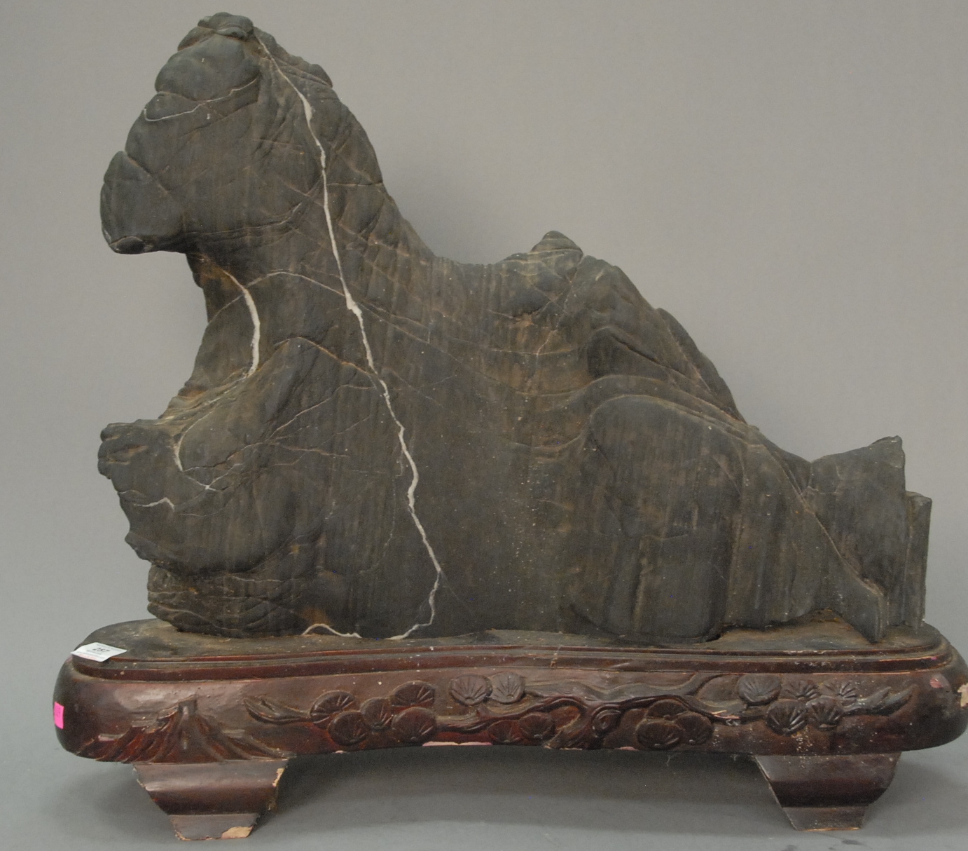 Large antique scholar’s stone in vaguely zoomorphic shape possibly a horse, with carved and fitted wooden base, China 19th/20th century. lg. 25in. ht. 19in.