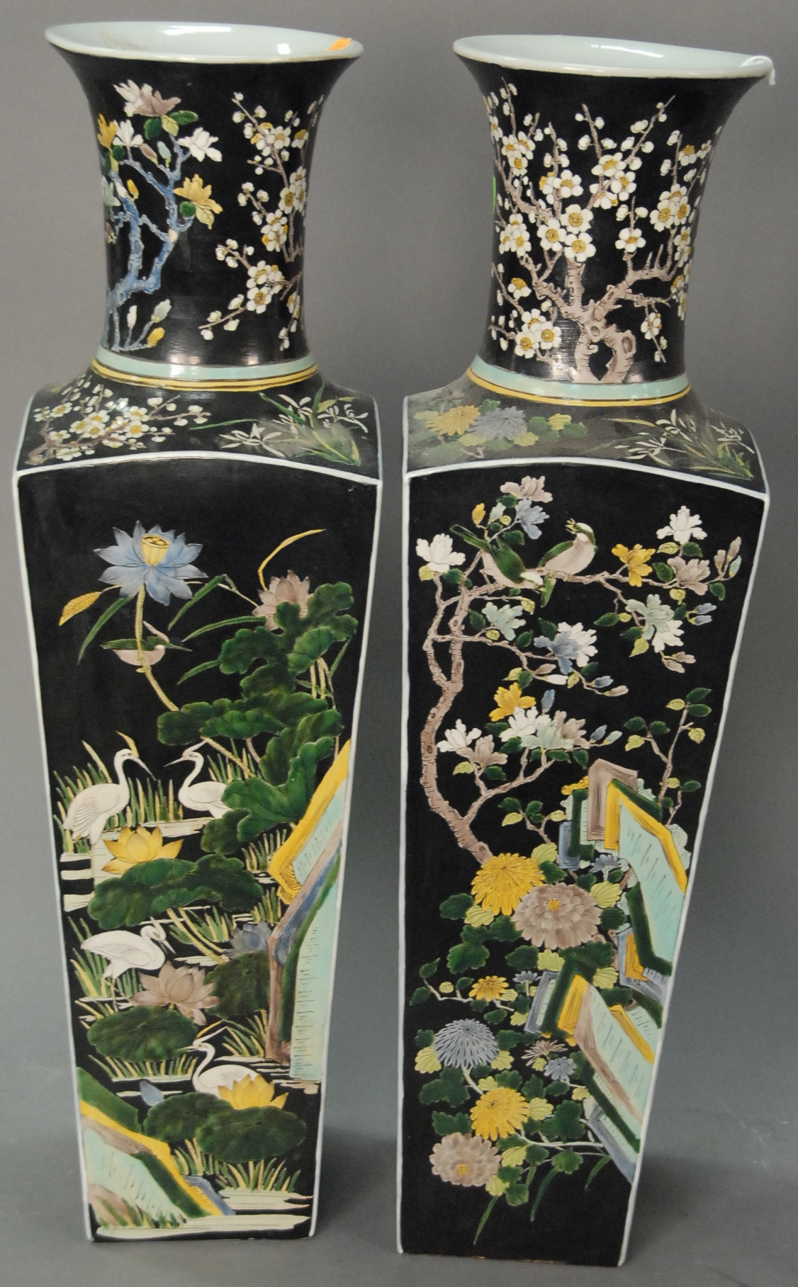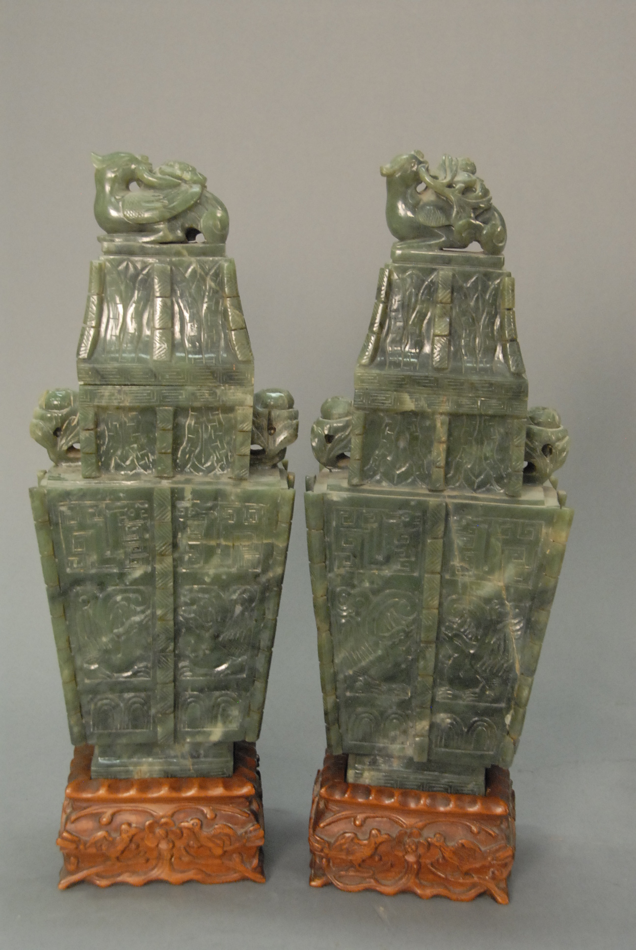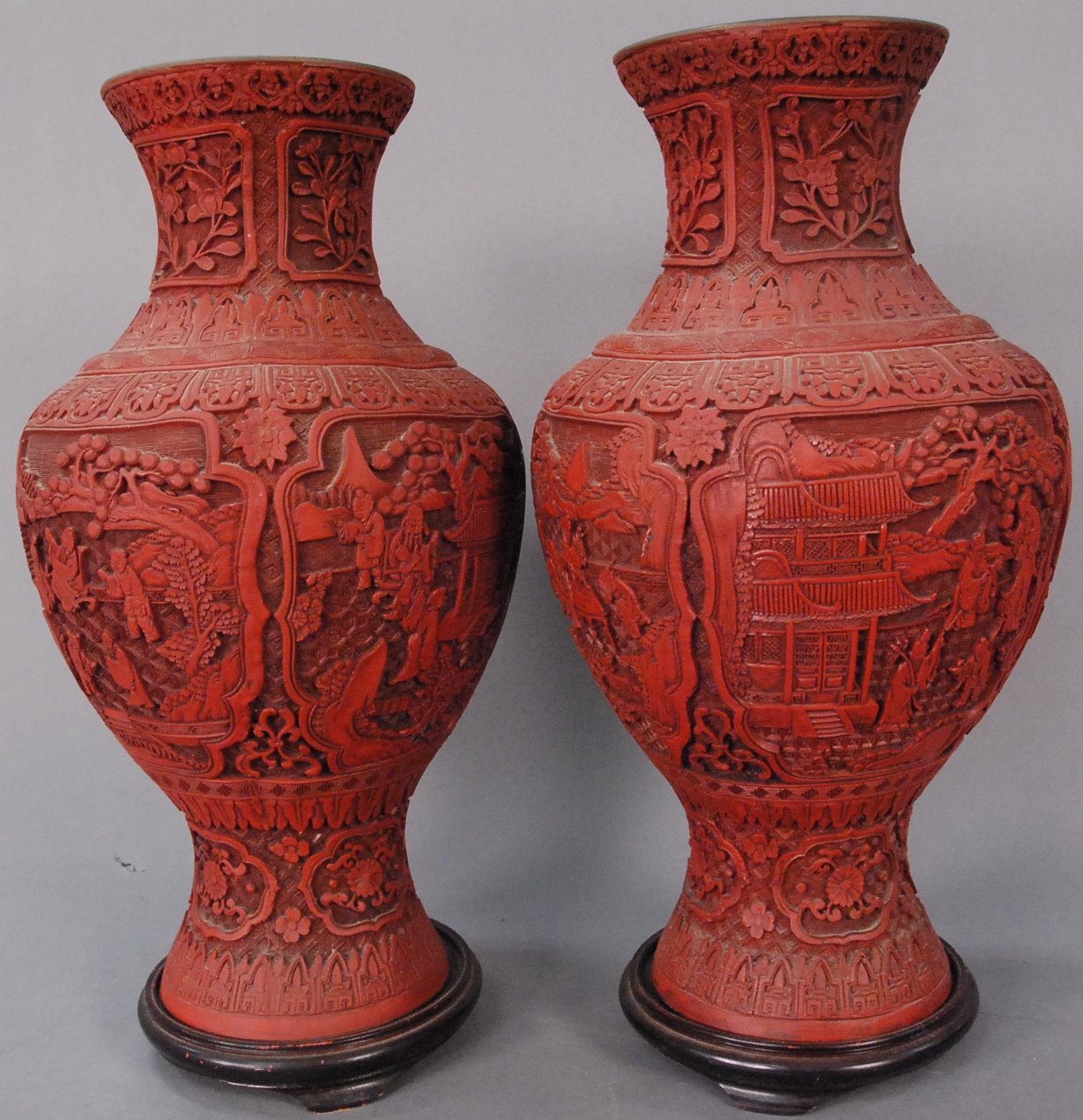 Pair of cinnabar baluster vases decorated with court scenes and stylized borders, fitted wooden bases, China, 20th century one vase with split. ht. 19in.