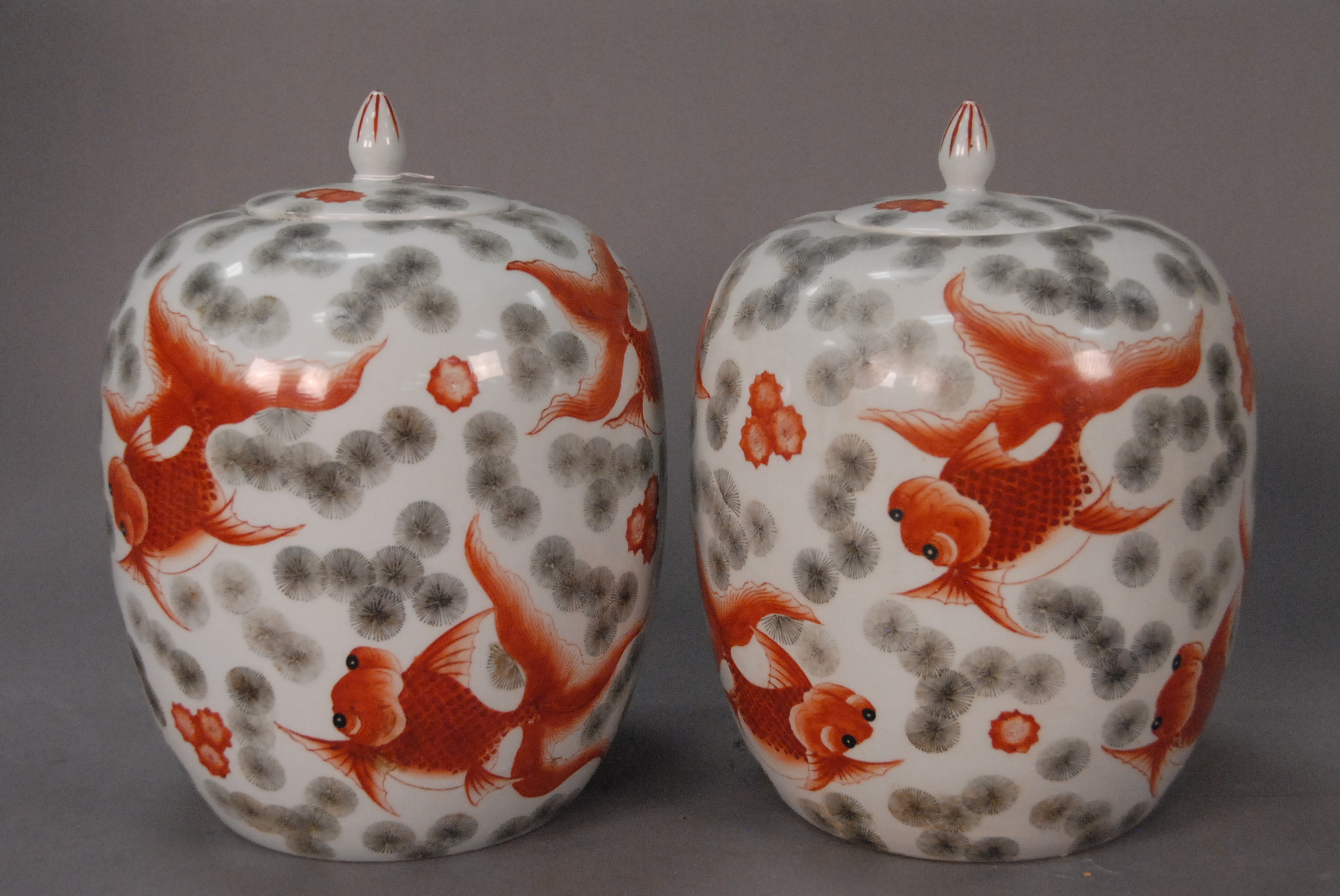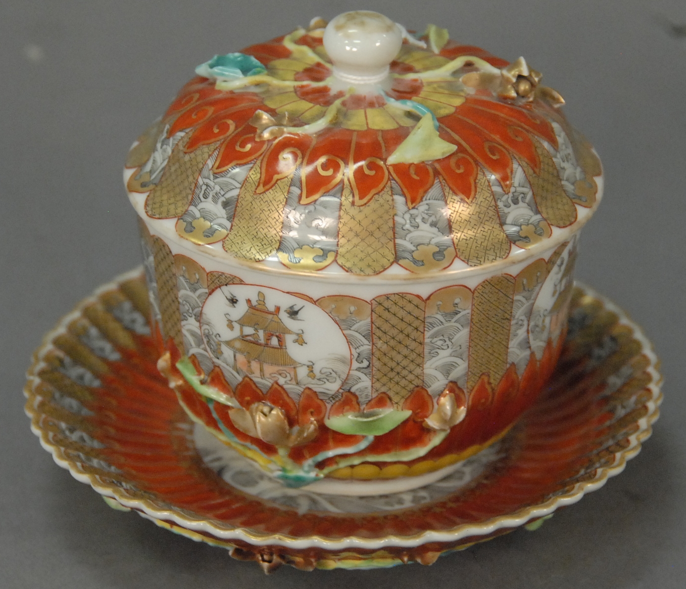 Porcelain sucrier with cover and lotus undertray painted with grisaille waves, gilt and orange petals, applied lotus motif, China 18th/19th century. dia. 6in. ht. 4in.