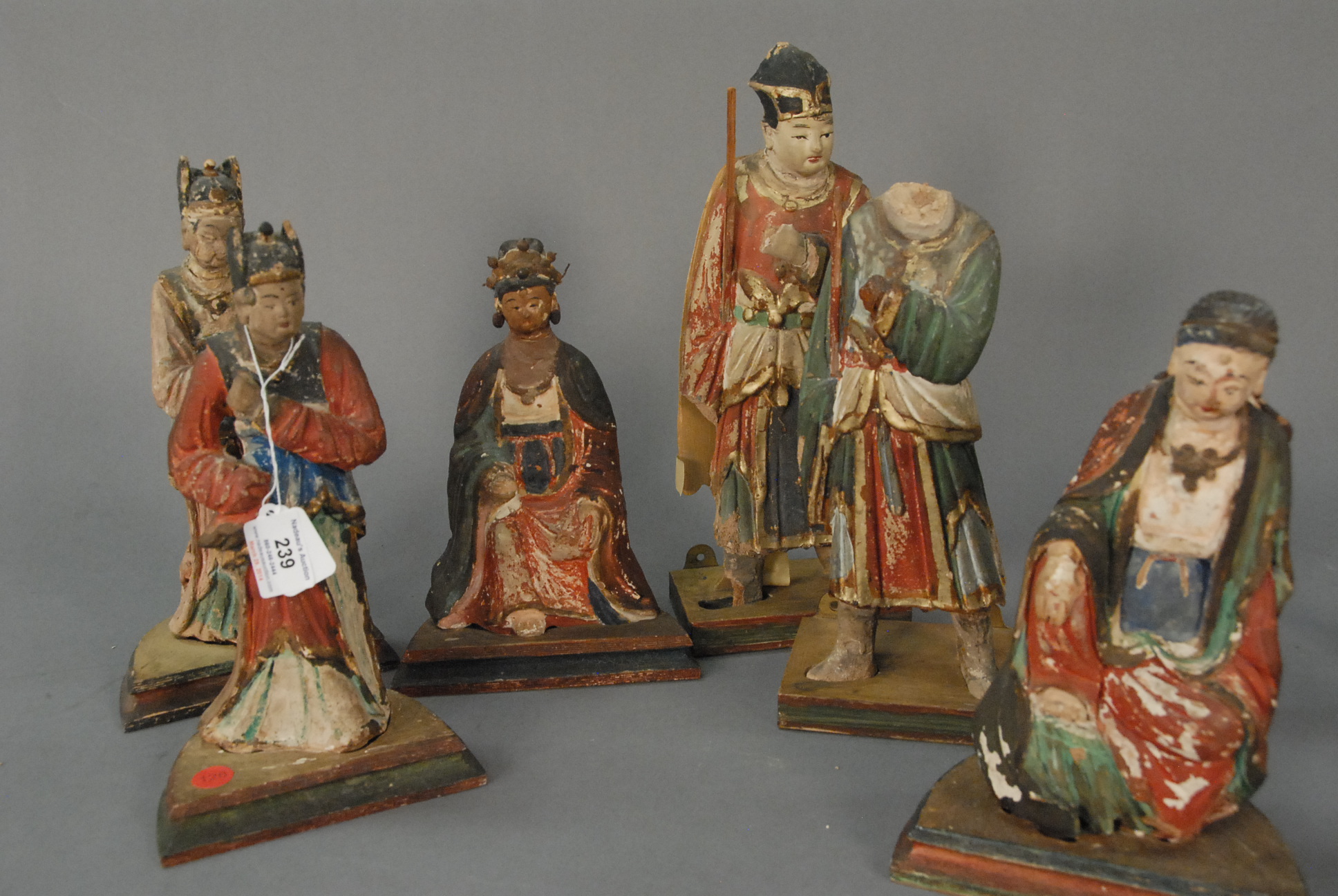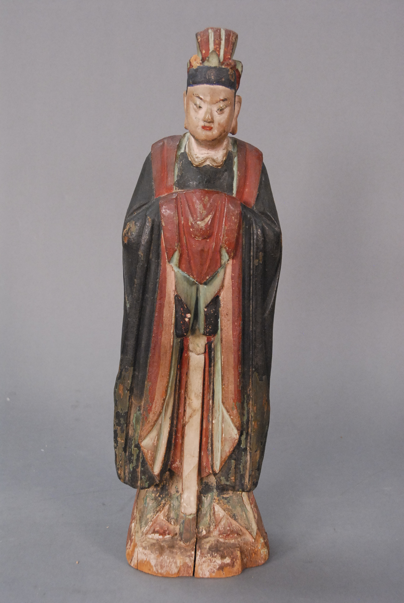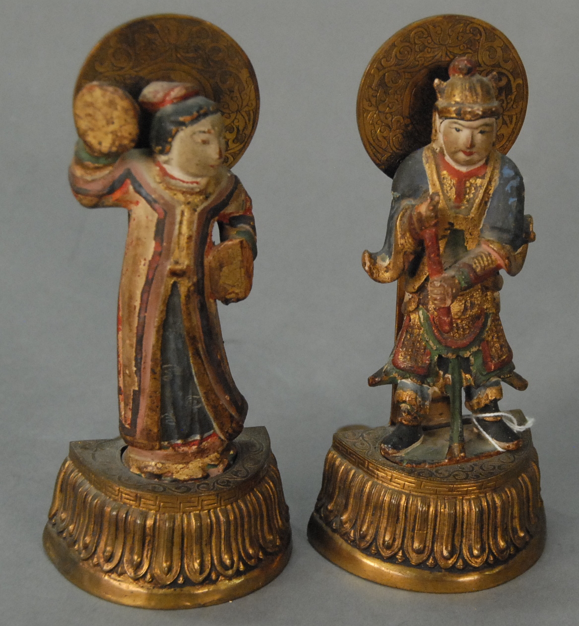 Pair of bookends comprised of painted wood figures inserted into brass holders in the shape of lotus, marked China, 20th century wear to paint and portion of cymbal missing. ht. 7in.