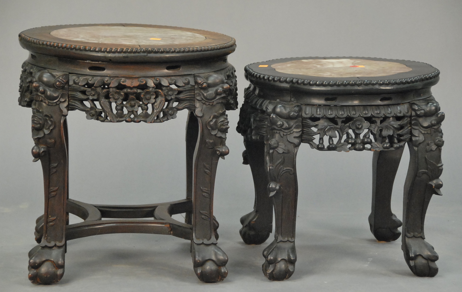 Two hardwood taborets, both with russet marble inlaid tops and heavily carved openwork aprons with ball-and-claw legs, China, 19th century lobed top lose. ht. 16in. and 18in.