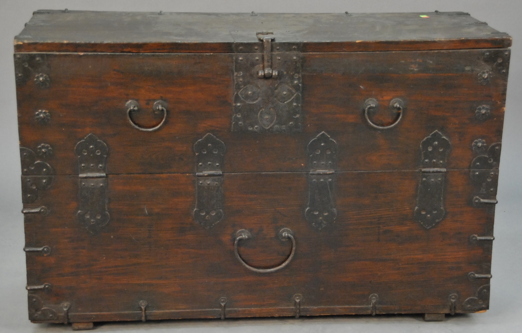 Large low wooden chest Bandaji with iron hardware and handles, single compartment with front opening hinged panel, of walnut or zelkova wood, Korea, Joseon Dynasty, 19th century. ht. 29in. lg. 45in. wd. 18in.