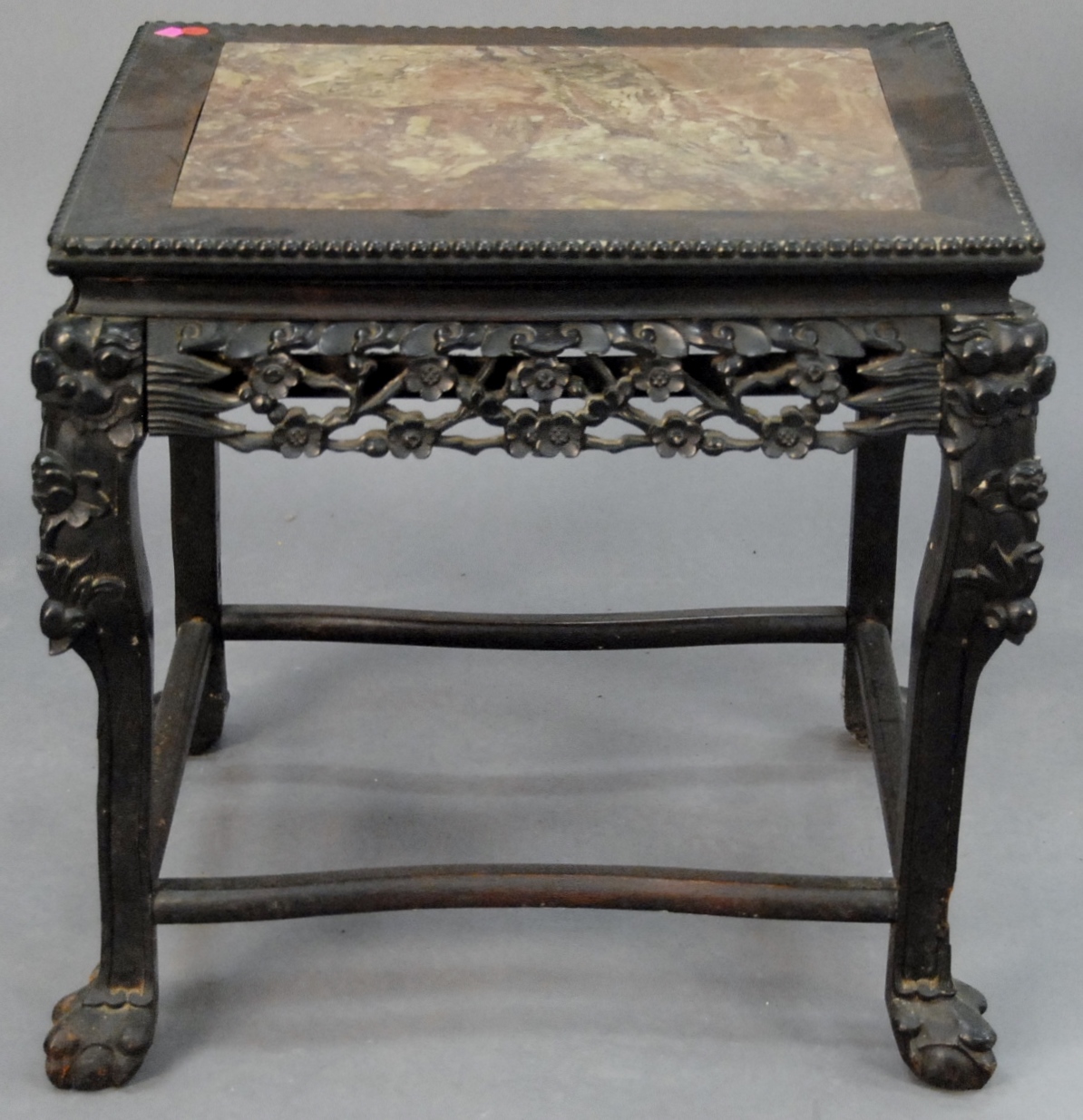 Large square hardwood taboret with russet marble top, carved openwork apron depicting prunus, shoulders with masks, ball and claw feet with open stretcher, China, 19th/20th century. ht. 22in. top: 23 x 23