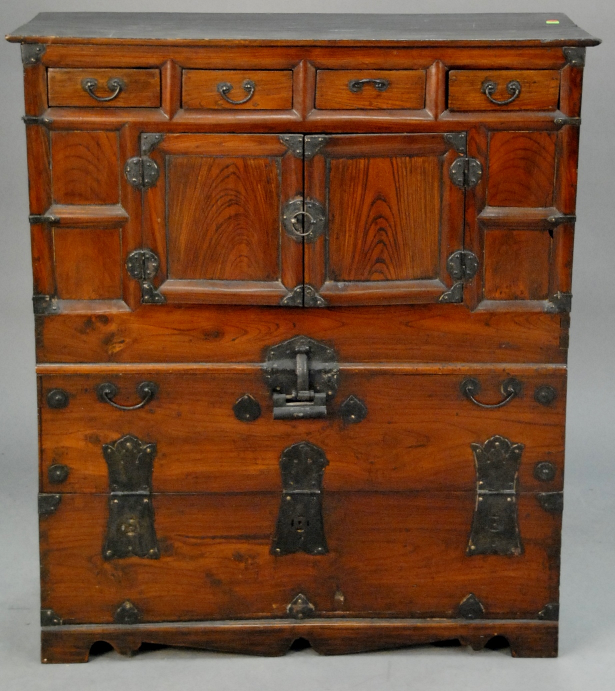 High wooden chest/bureau Bandaji with iron hardware and handles, three-tiered with four small top drawers double-door center and front-opening hinged bottom panel, Korea, Joseon/Korean Dynasty, 19th century. ht. 40in. lg. 33 1/2in. wd. 16in.