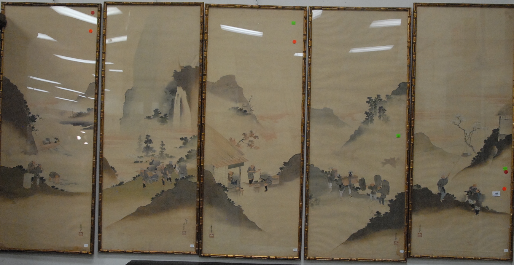 Set of five framed paintings on silk of genre landscapes with workmen and travelers showing the influence of Hiroshige and Hokusai, signed by artist and with Mt. Fuji seal, Japan, 19th/20th century. 16 x 48