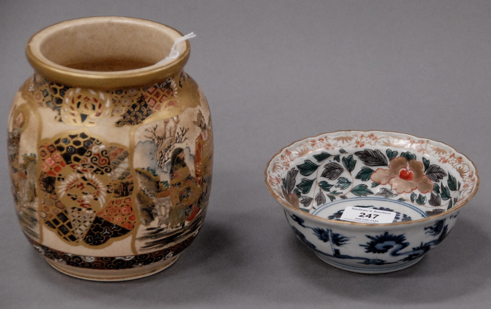 Two piece lot to include small Imari bowl with scalloped/foliated rim, interior painted with gilt peonies. dia. 6in. and Kyoto Satsuma jar decorated with court and religious figures unmarked ht. 6 1/2in., both Japan, 19th century.