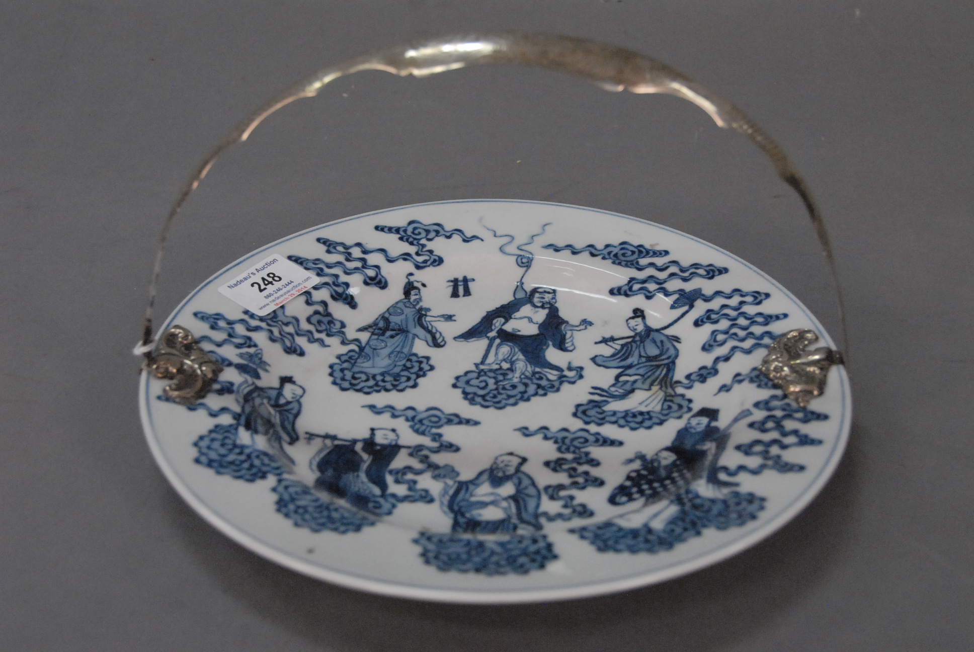 Blue and white Kangxi plate depicting the Eight Immortals, with American/European silver handle mounts and six-character underglaze Ming Zhengde mark, China 18th century one hinge lose. dia. 10in.