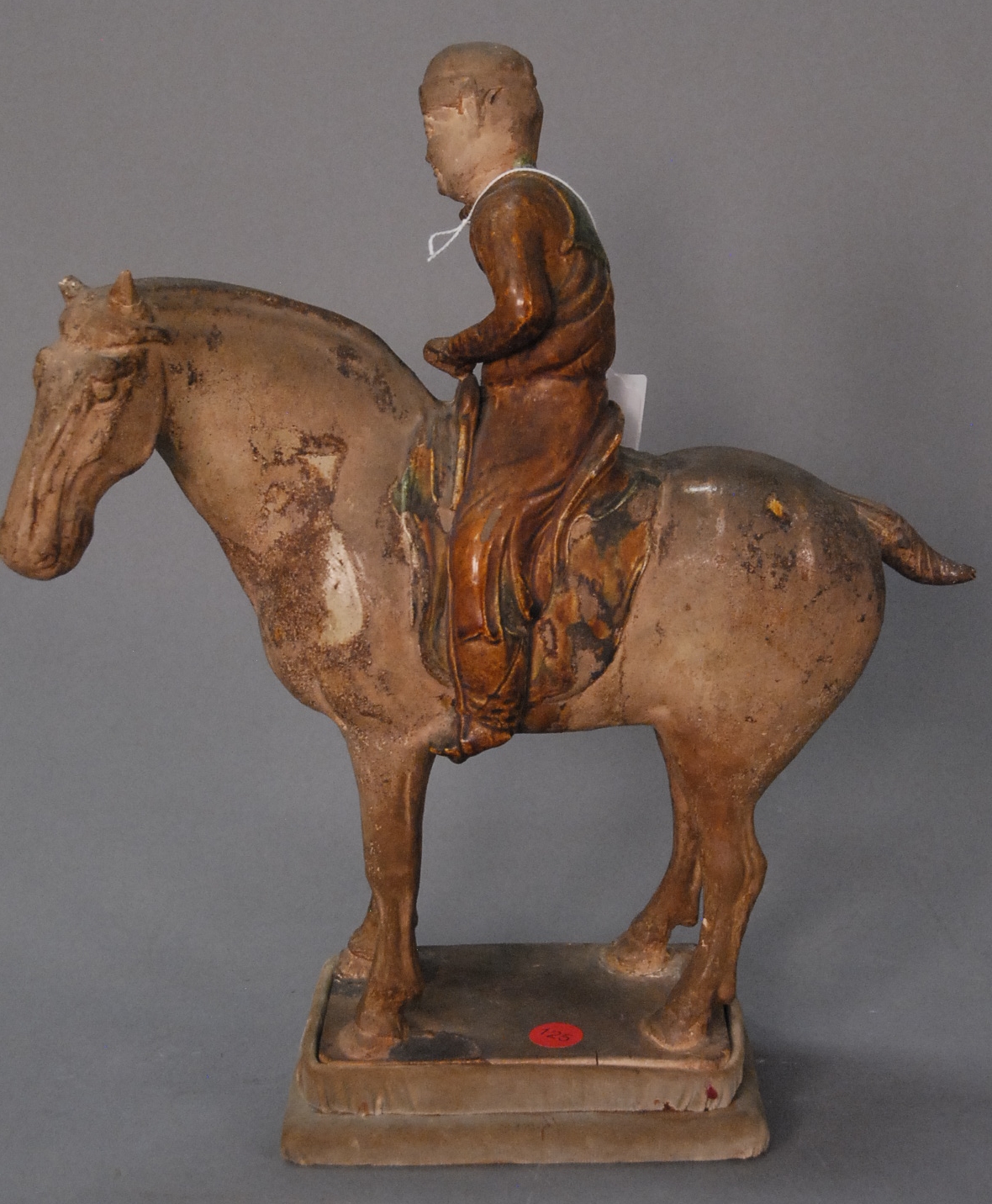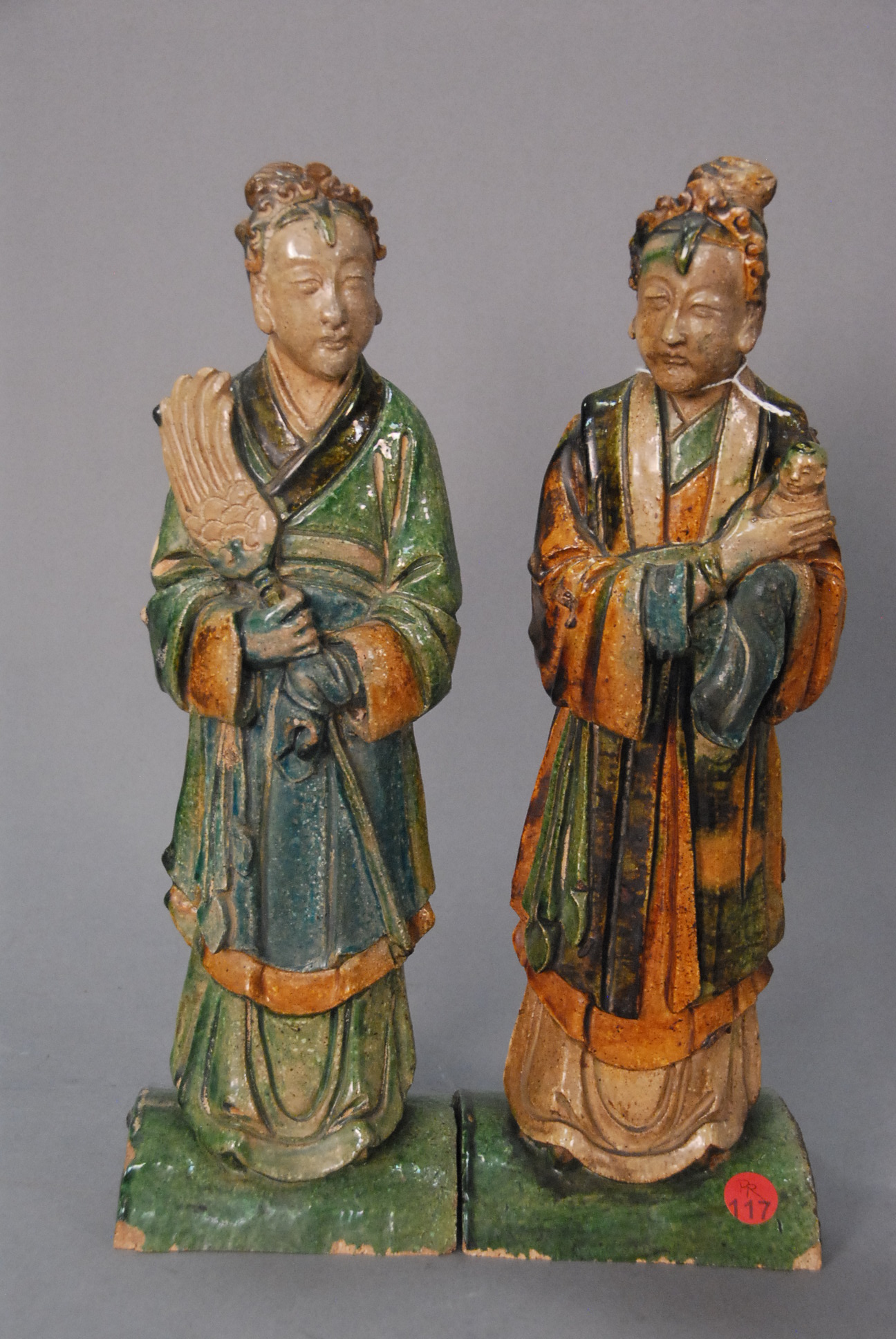 Pair of figural roof tiles in sancai glaze depicting standing female attendants/household goddesses, one holds a child, the other a broom, China, 19th/20th century minor loss to bases. ht. 14 1/2in.
