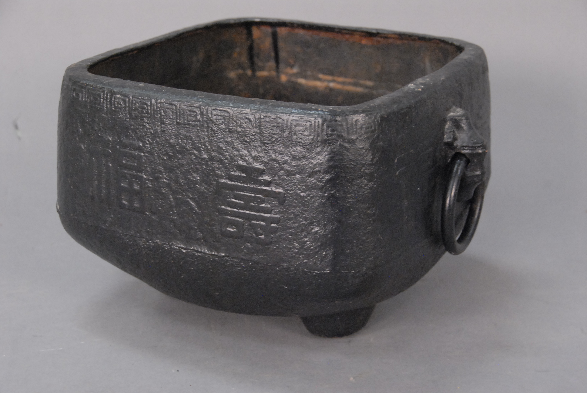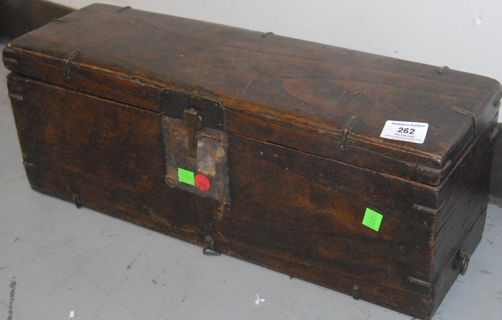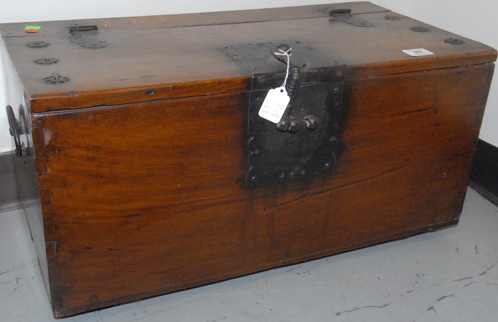 Small hardwood chest Bandaji with iron hardware, single compartment with sliding top, possibly for rice storage, Korea, Joseon Dynasty, 19th century. ht. 7in. lg. 22in. wd. 12in.