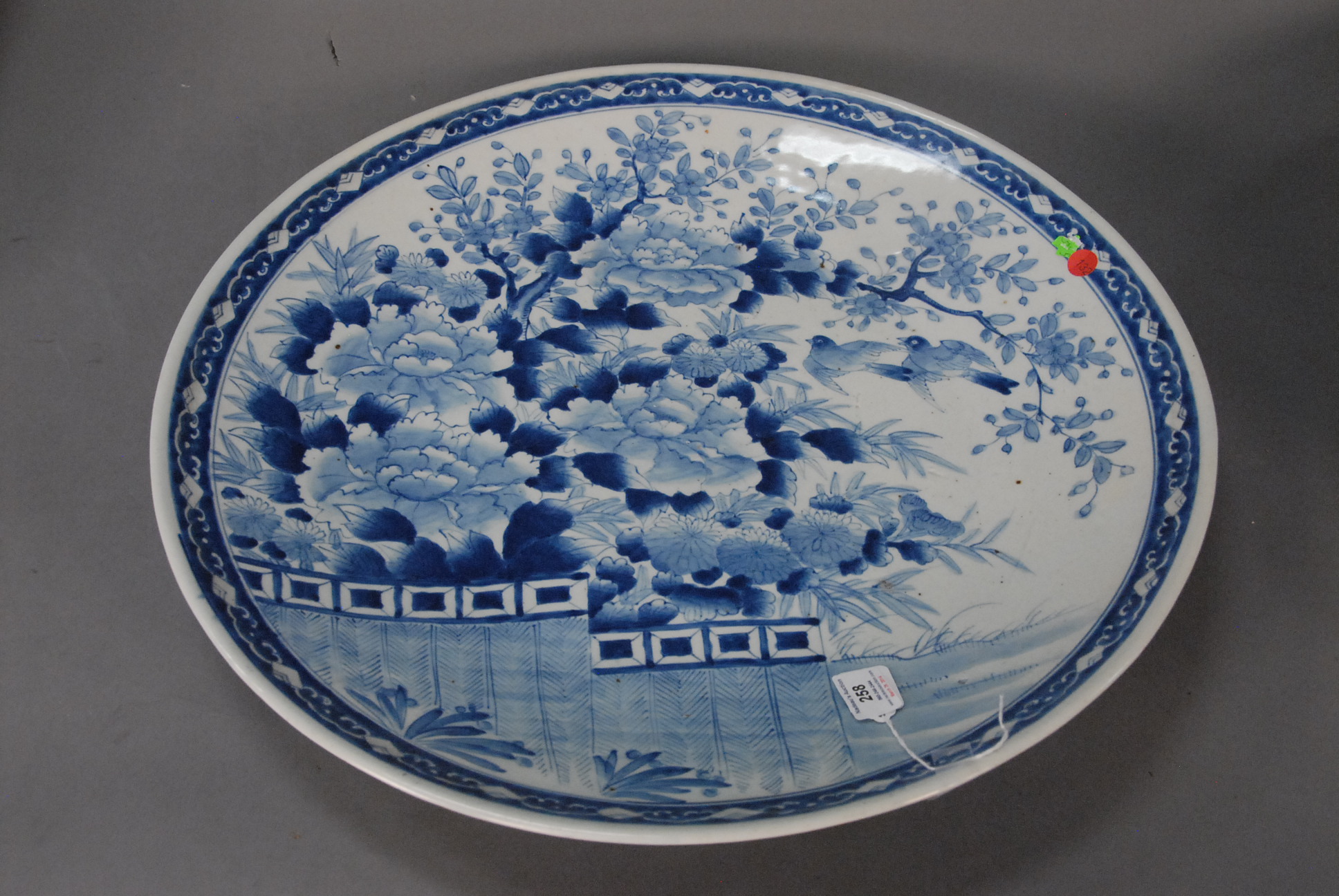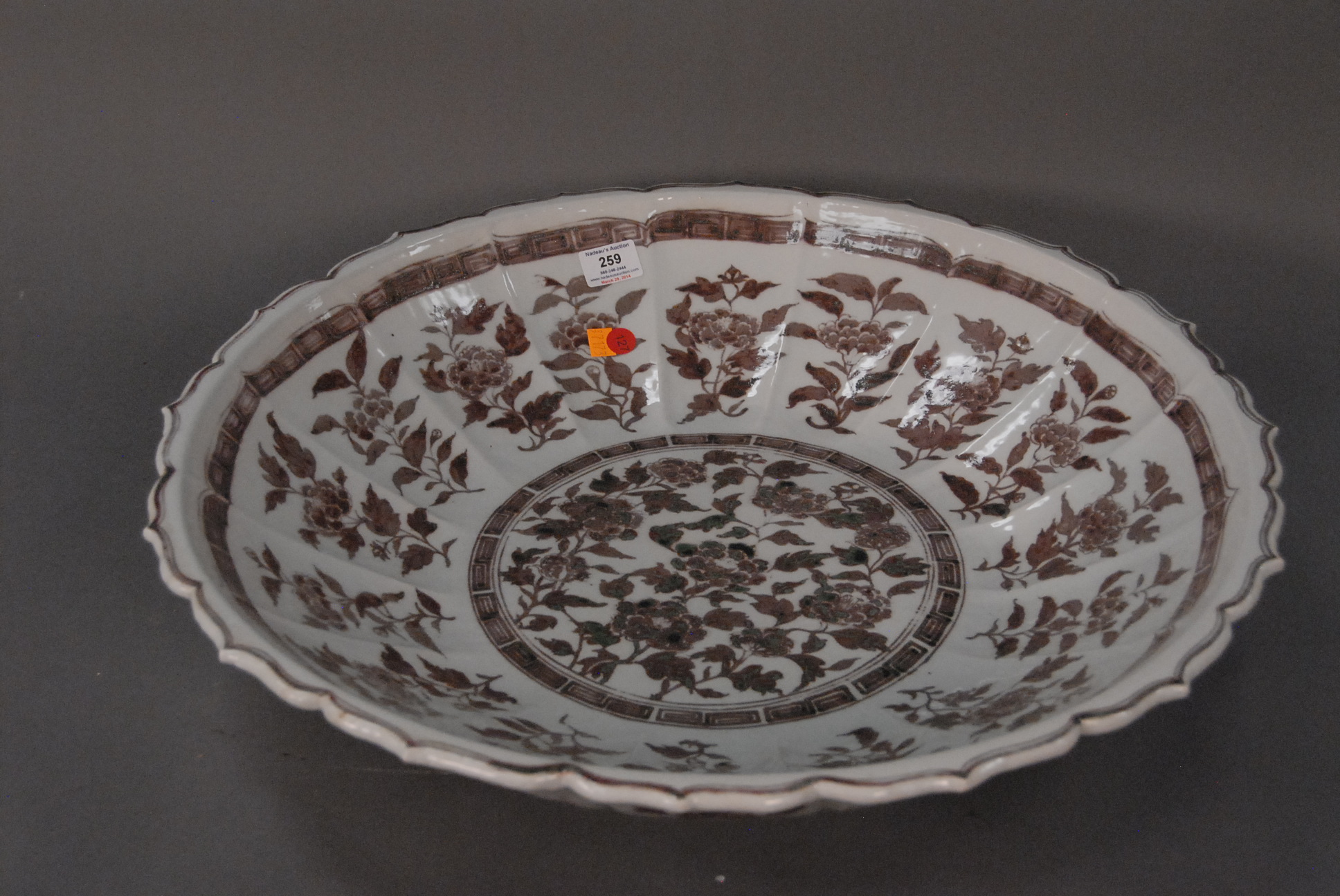 Massive underglazed red charger in Ming style with lobed body and scalloped/foliated rim, having overall peony decoration, China, 20th century. dia. 24in.