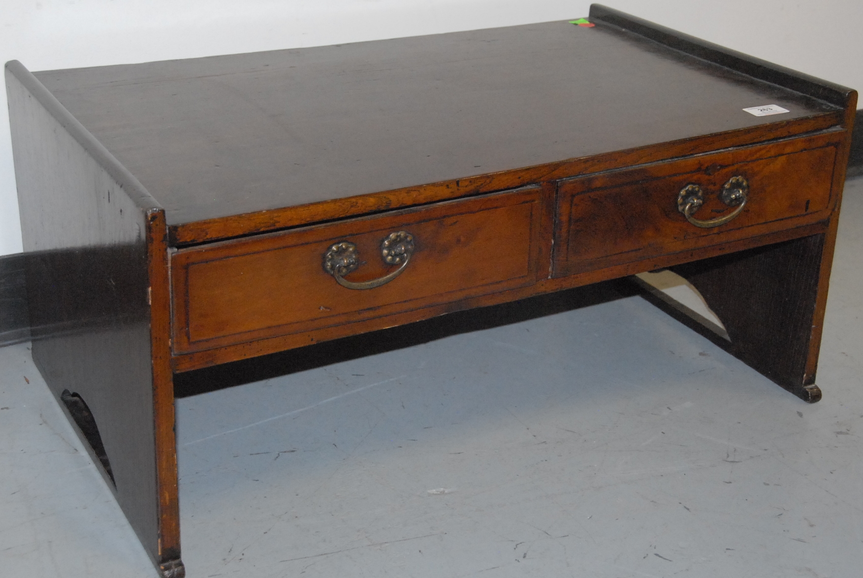 Small floor/traveling desk with two drawers with bronze pulls and side openwork handles, Korea, 19th century warp to left drawer facing. ht. 13in. top: 17 x 28