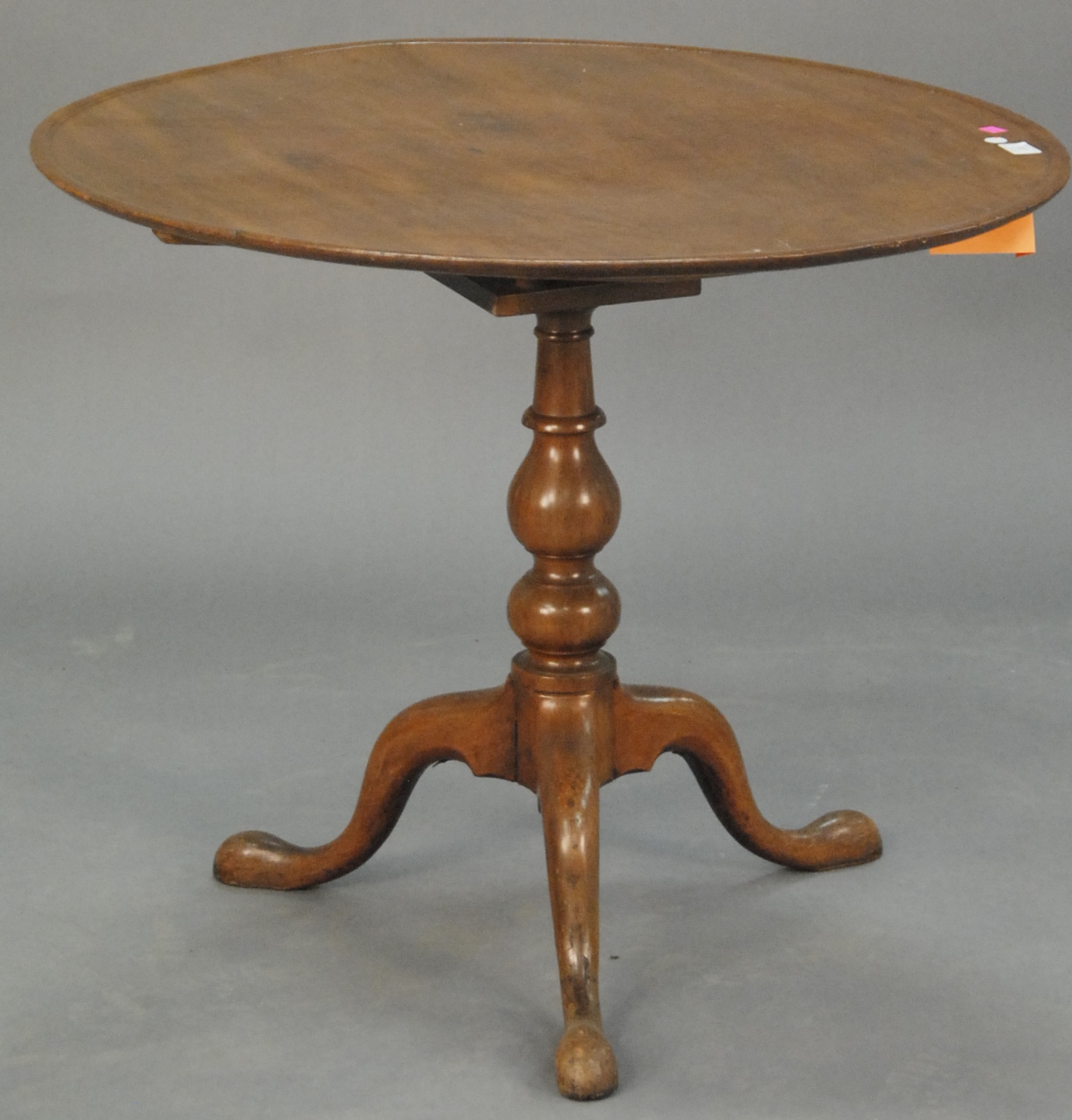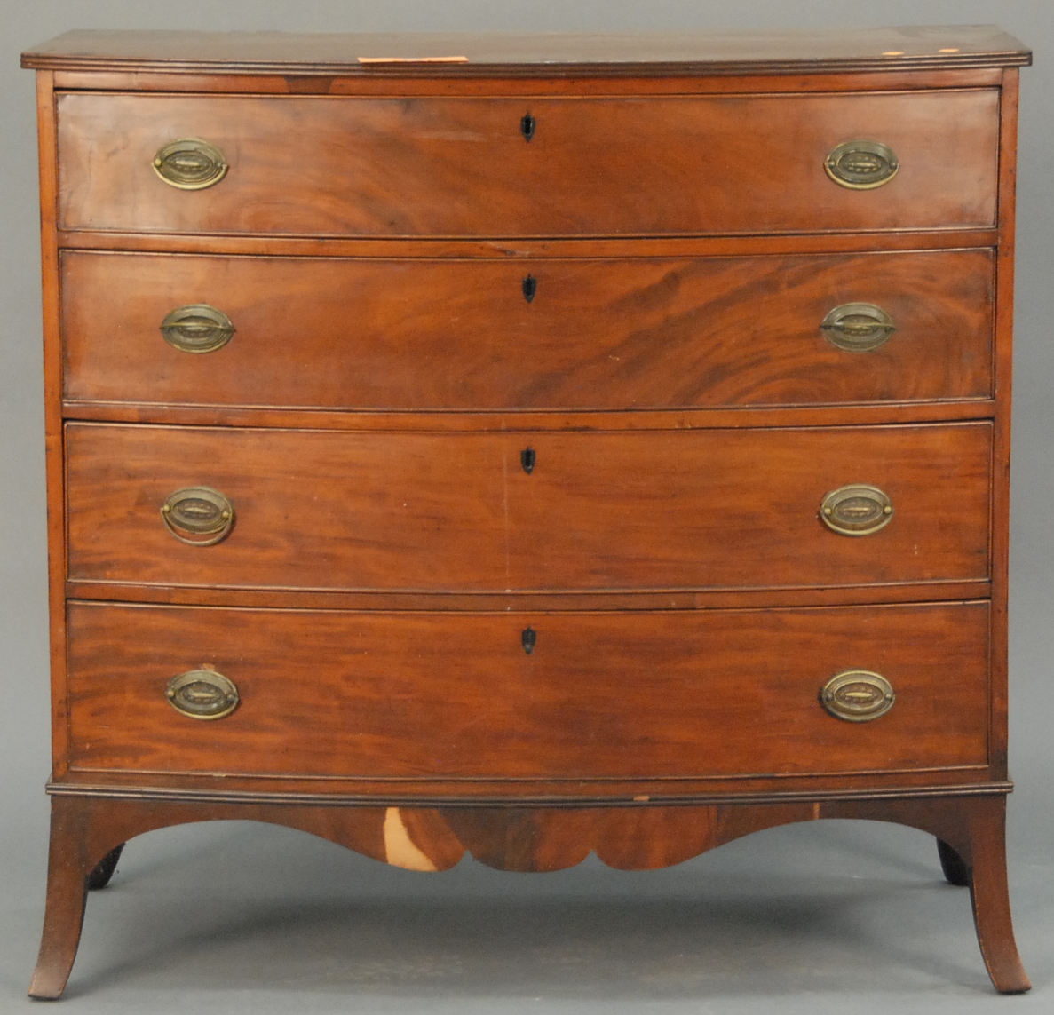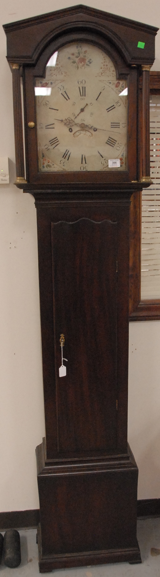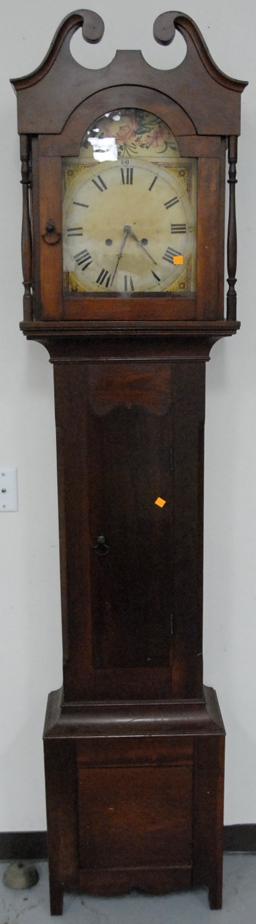 Tall case clock, mahogany and mahogany veneer having pediment top over tombstone dial with scalloped top door on plain base with bracket feet low, painted porcelain tombstone dial with brass works. ht. 82in.