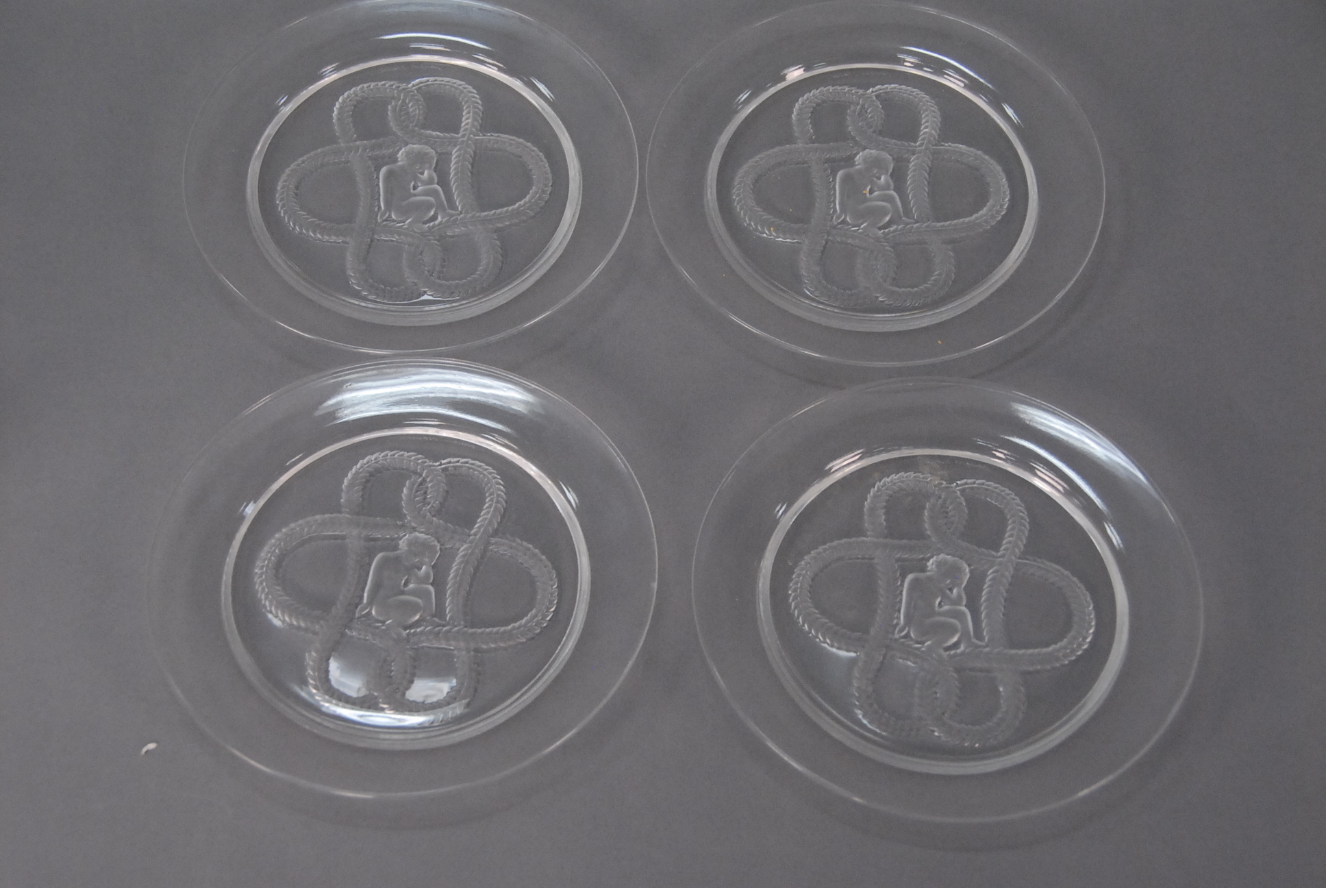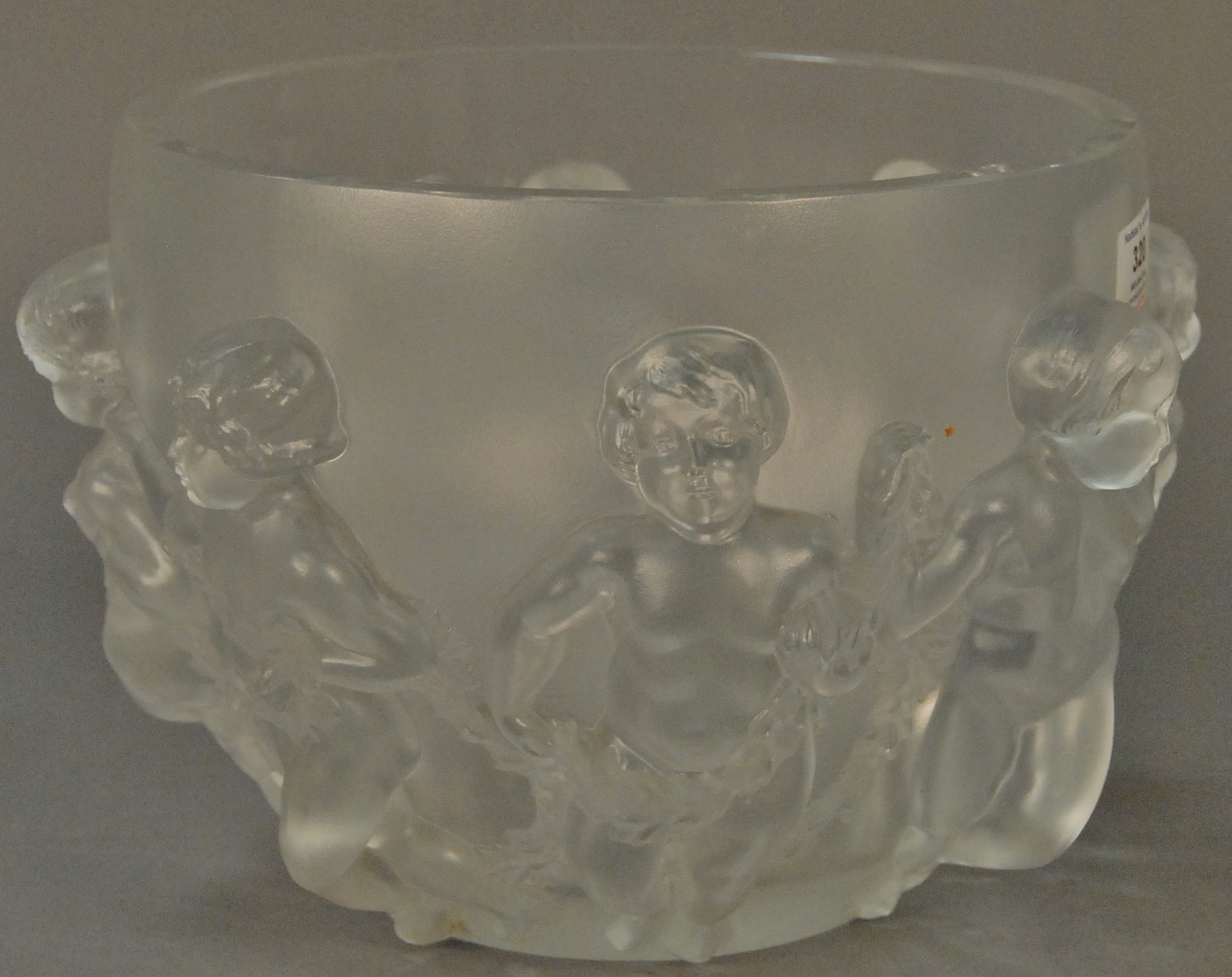 Lalique molded and partially frosted globular vase with three dimensional cherub figures, late 20th century overall wear, scratches. ht. 8 1/2in. dia. 10 1/2in. dia. with figures 13 1/2in.