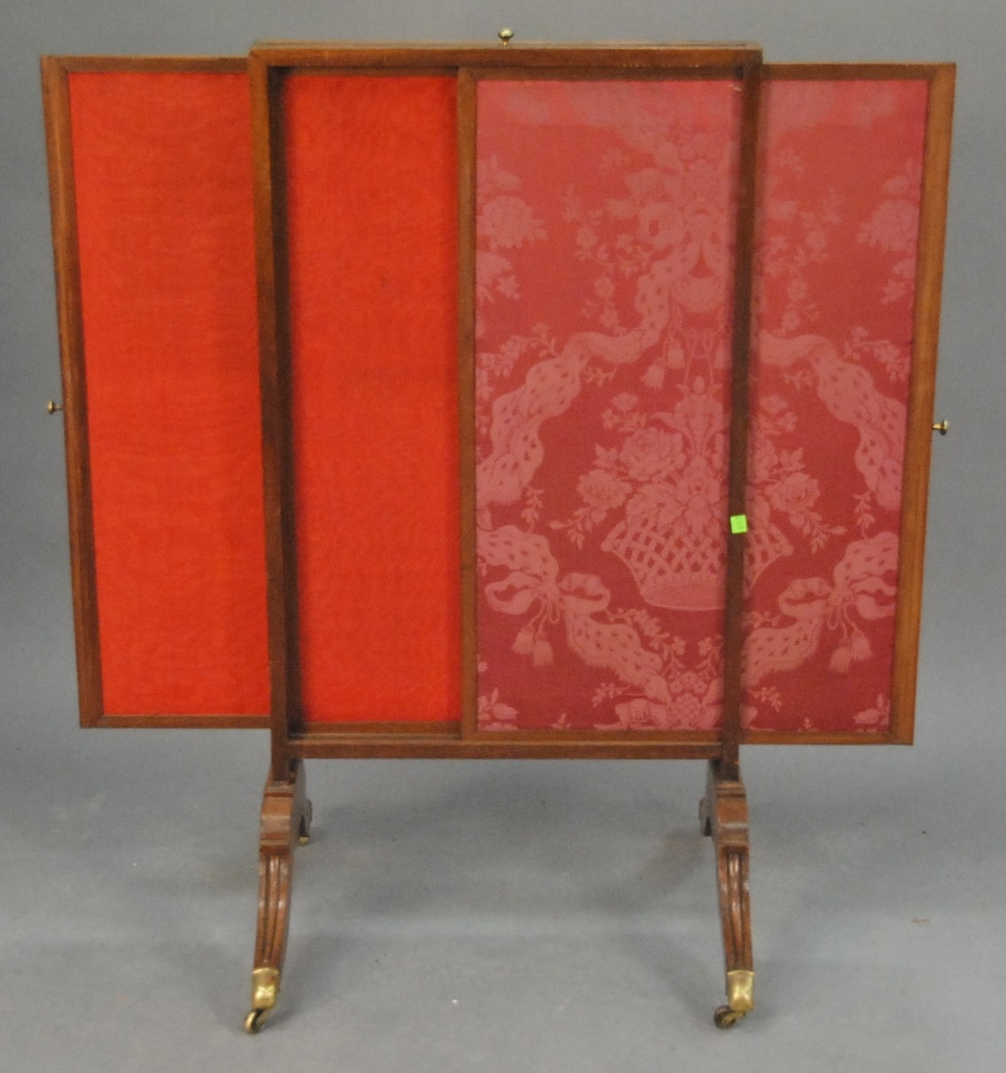 New York Federal mahogany triple panel adjustable fire screen with rose brocade panels, saber molded legs ending in brass capped feet, fitted with casters, first quarter 19th century. closed: ht. 44in. wd. 33in.