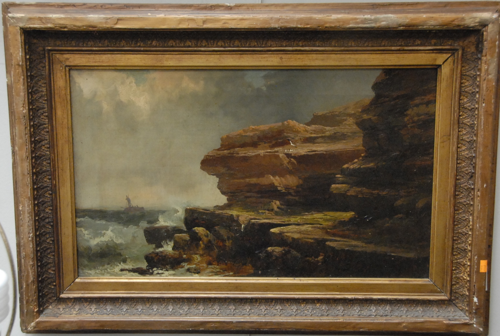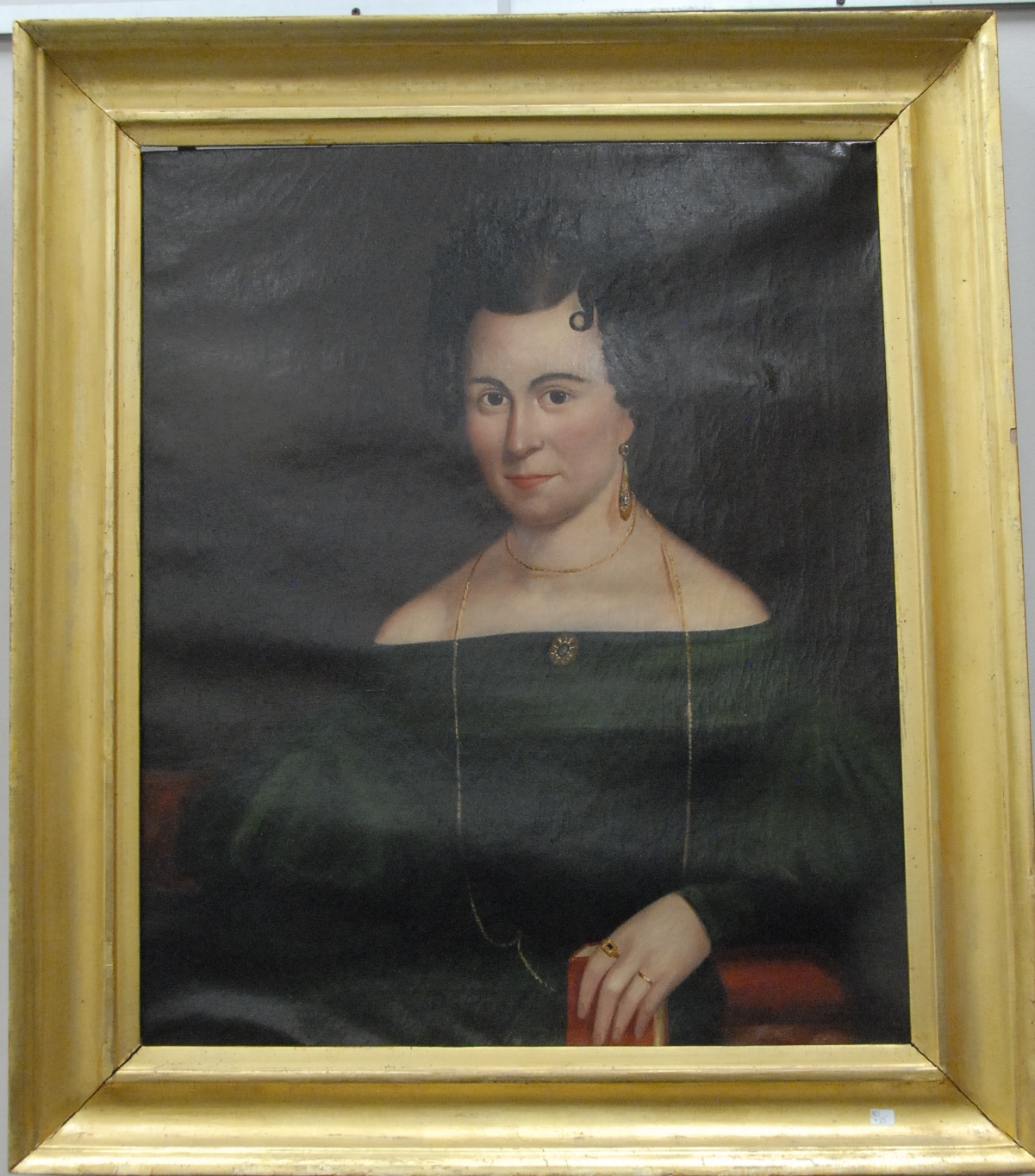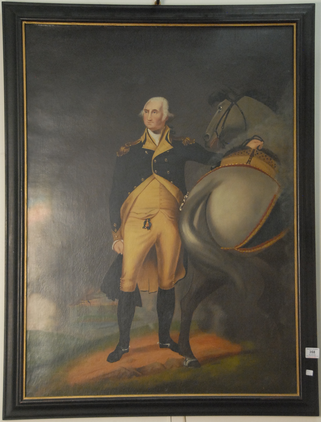 GENERAL GEORGE WASHINGTON AT DORCHESTER HEIGHTS, MARCH, 1776 oil on canvas unsigned copy of the famous painting done by Gilbert Stuart in 1806 full portrait of George Washington with his hand on the rear of his horse. ‘Horn’ in white chalk verso also faint name in pencil 19th century in black molded frame with gilt liner image size: 37 1/8 x 27 1/8 overall size: 41 3/4 x 31 5/8