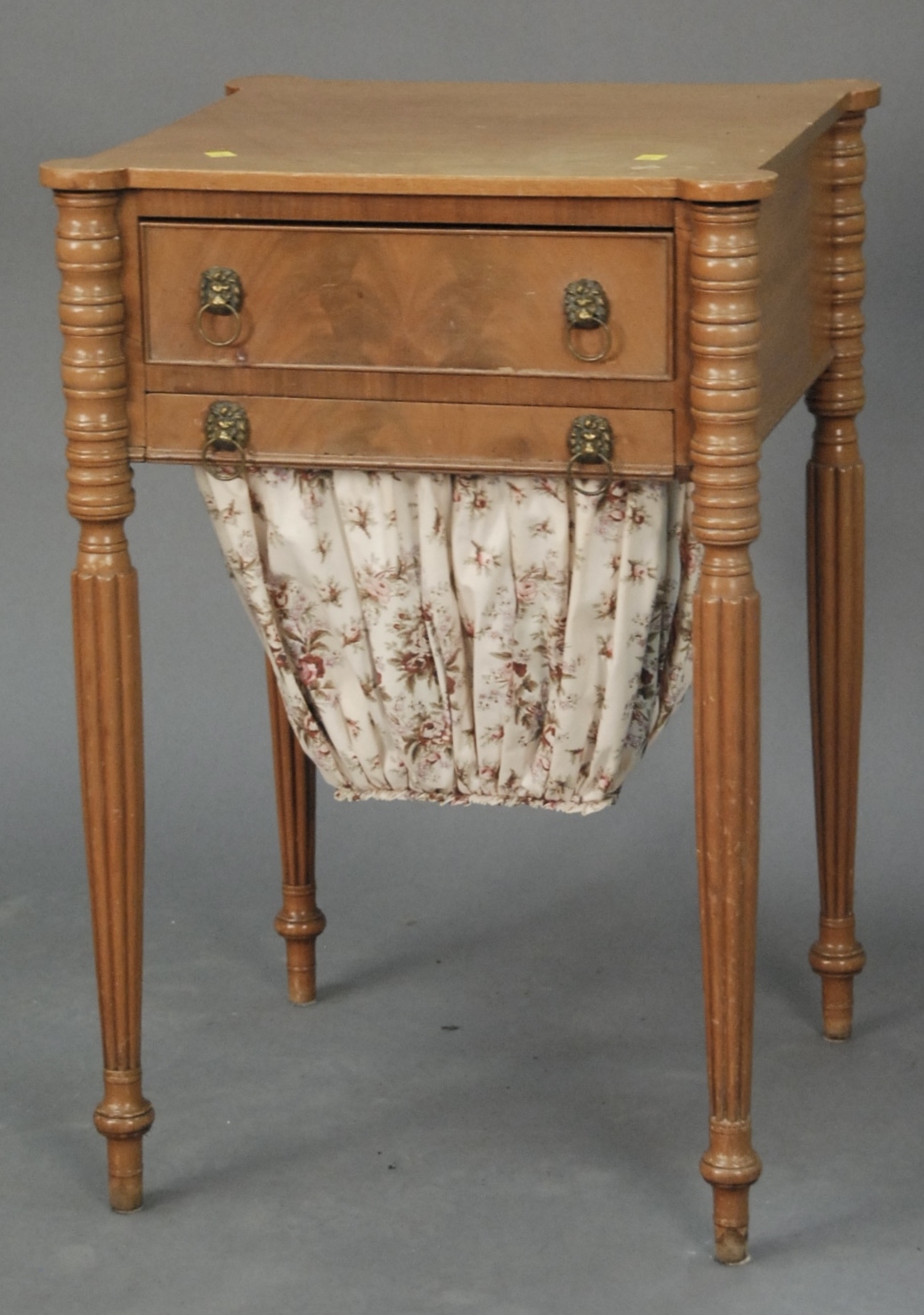 Sheraton mahogany sewing stand with drawer and bag, drawer top with turret corners, all set on turned and fluted legs in light finish. ht. 28 1/2in. wd. 17 1/2in. dp. 17 1/2in.