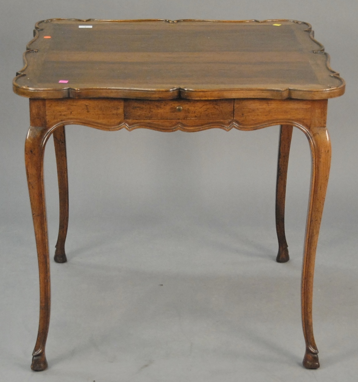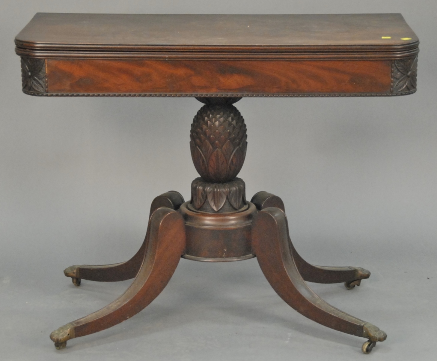 Duncan Phyfe mahogany game table having rectangular top set on pineapple carved pedestal on four down swept members ending in brass paw feet on brass casters, circa 1840. ht. 30in. top: 38 x 38